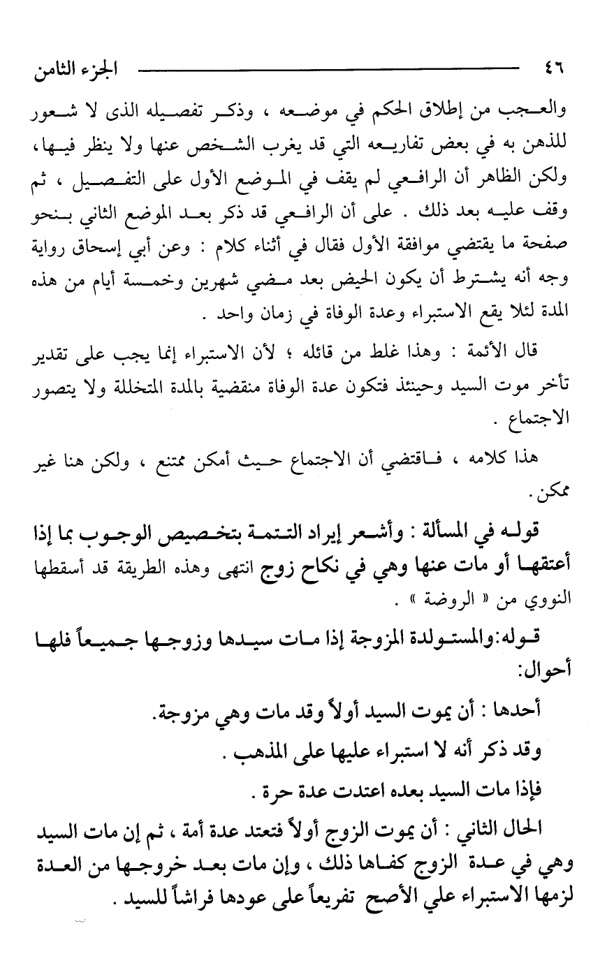 والعجب من إطلاق الحكم في موضعه، وذكر تفصيله الذى لا شعور للذهن به في بعض تفاريعه التي قد يغرب الشخص عنها ولا ينظر فيها، ولكن الظاهر أن الرافعي لم يقف في الموضع الأول على التفصيل، ثم وقف عليه بعد ذلك. على أن الرافعي قد ذكر بعد الموضع الثاني بنحو صفحة ما يقتضي موافقة الأول فقال في أثناء كلام: وعن أبي إسحاق رواية وجه أنه يشترط أن يكون الحيض بعد مضي شهرين وخمسة أيام من هذه المدة لئلا يقع الاستبراء وعدة الوفاة في زمان واحد.