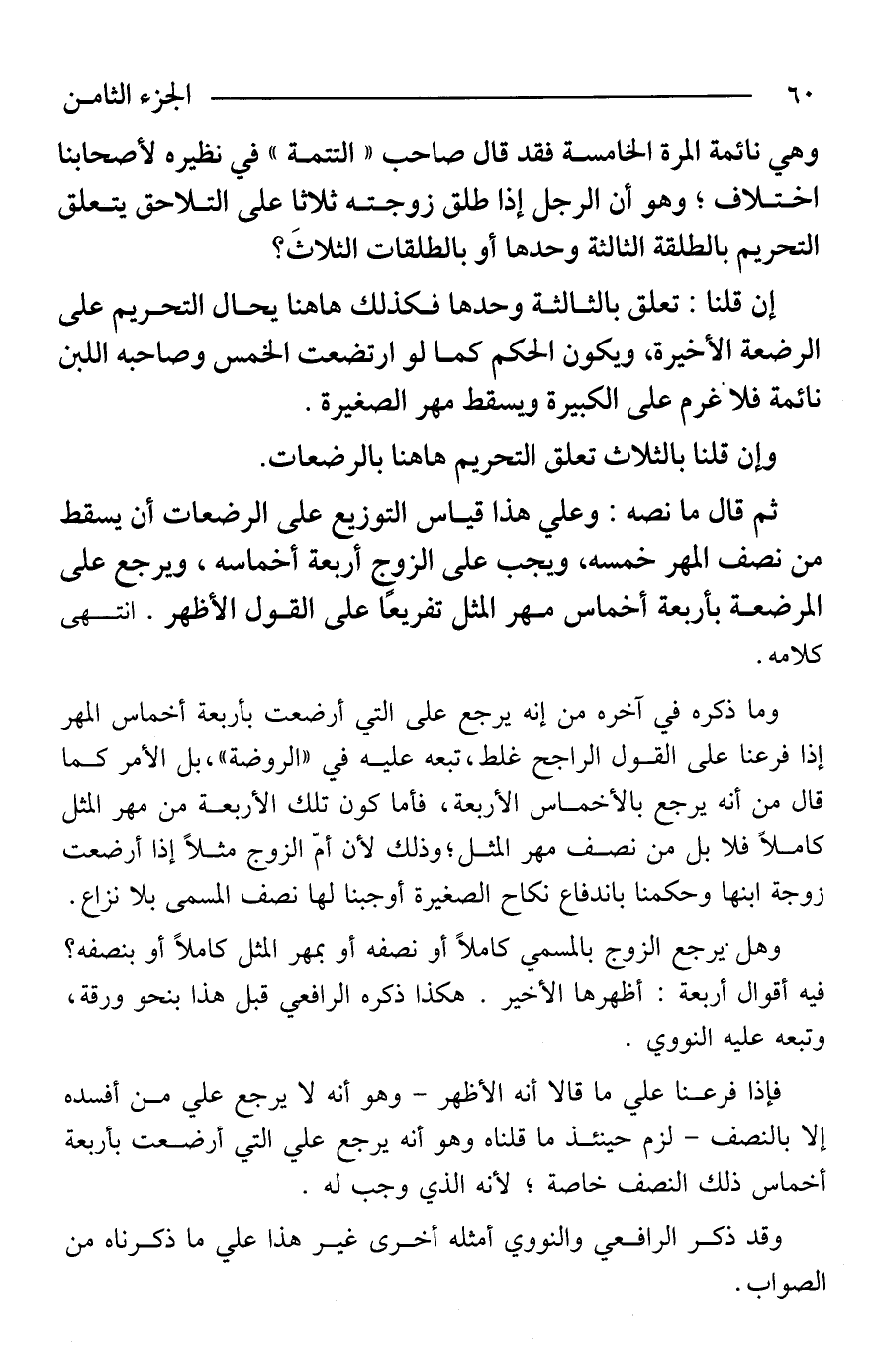 ثم قال ما نصه: وعلي هذا قياس التوزيع على الرضعات أن يسقط من نصف المهر خمسه، ويجب على الزوج أربعة أخماسه، ويرجع على المرضعة بأربعة أخماس مهر المثل تفريعًا على القول الأظهر. انتهى كلامه.