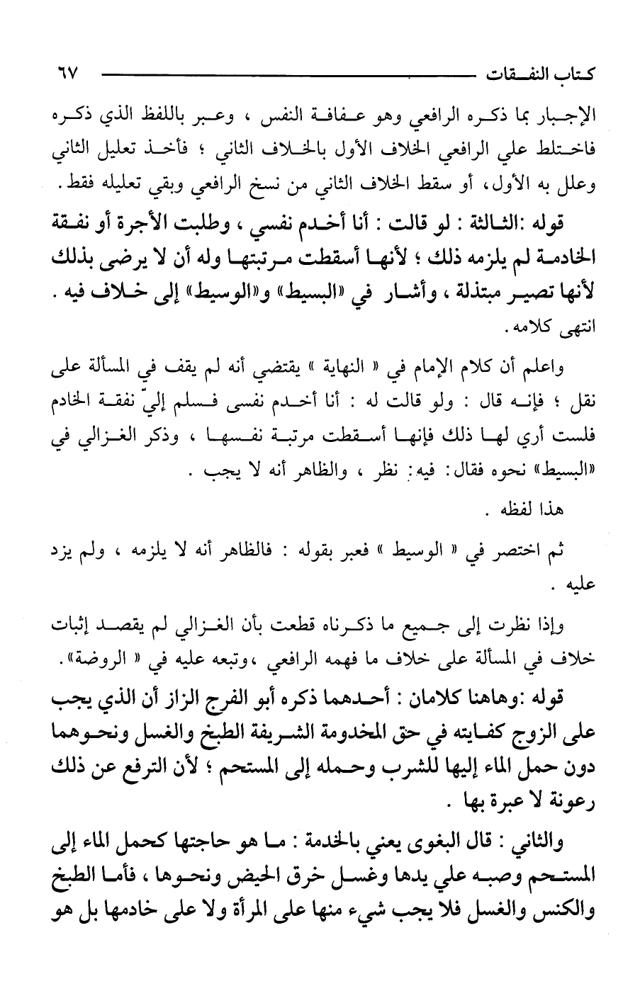 قوله: وهاهنا كلامان: أحدهما ذكره أبو الفرج الزاز أن الذي يجب على الزوج كفايته في حق المخدومة الشريفة الطبخ والغسل ونحوهما دون حمل الماء إليها للشرب وحمله إلى المستحم؛ لأن الترفع عن ذلك رعونة لا عبرة بها.