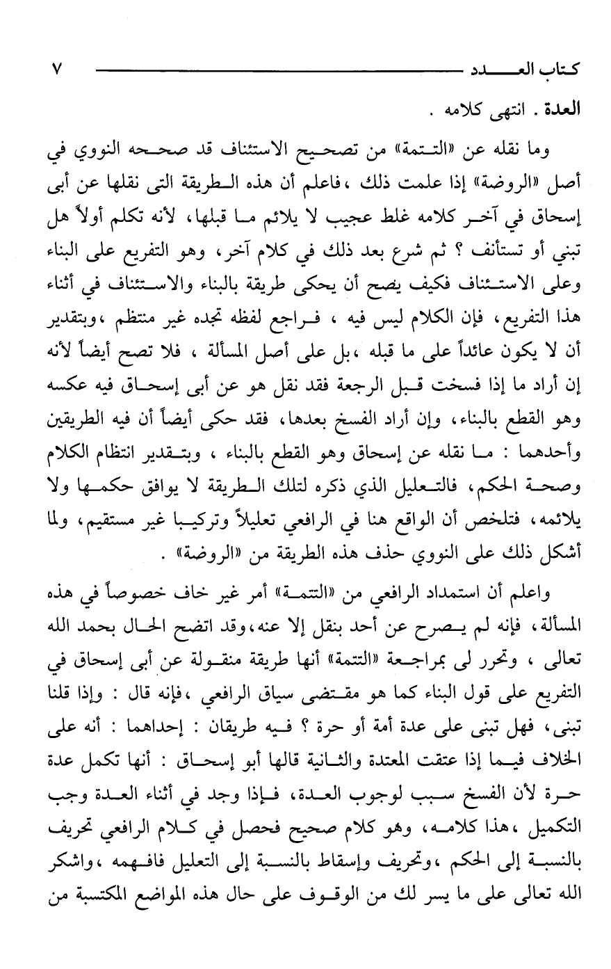 واعلم أن استمداد الرافعي من "التتمة" أمر غير خاف خصوصًا في هذه المسألة، فإنه لم يصرح عن أحد بنقل إلا عنه، وقد اتضح الحال بحمد الله تعالى، وتحرر لى بمراجعة "التتمة" أنها طريقة منقولة عن أبى إسحاق في التفريع على قول البناء كما هو مقتضى سياق الرافعي، فإنه قال: وإذا قلنا تبنى، فهل تبنى على عدة أمة أو حرة؟ فيه طريقان: إحداهما: أنه على الخلاف فيما إذا عتقت المعتدة والثانية قالها أبو إسحاق: أنها تكمل عدة حرة لأن الفسخ سبب لوجوب العدة، فإذا وجد في أثناء العدة وجب التكميل، هذا كلامه، وهو كلام صحيح فحصل في كلام الرافعي تحريف بالنسبة إلى الحكم، وتحريف وإسقاط بالنسبة إلى التعليل فافهمه، واشكر الله تعالى على ما يسر لك من الوقوف على حال هذه المواضع المكتسبة من