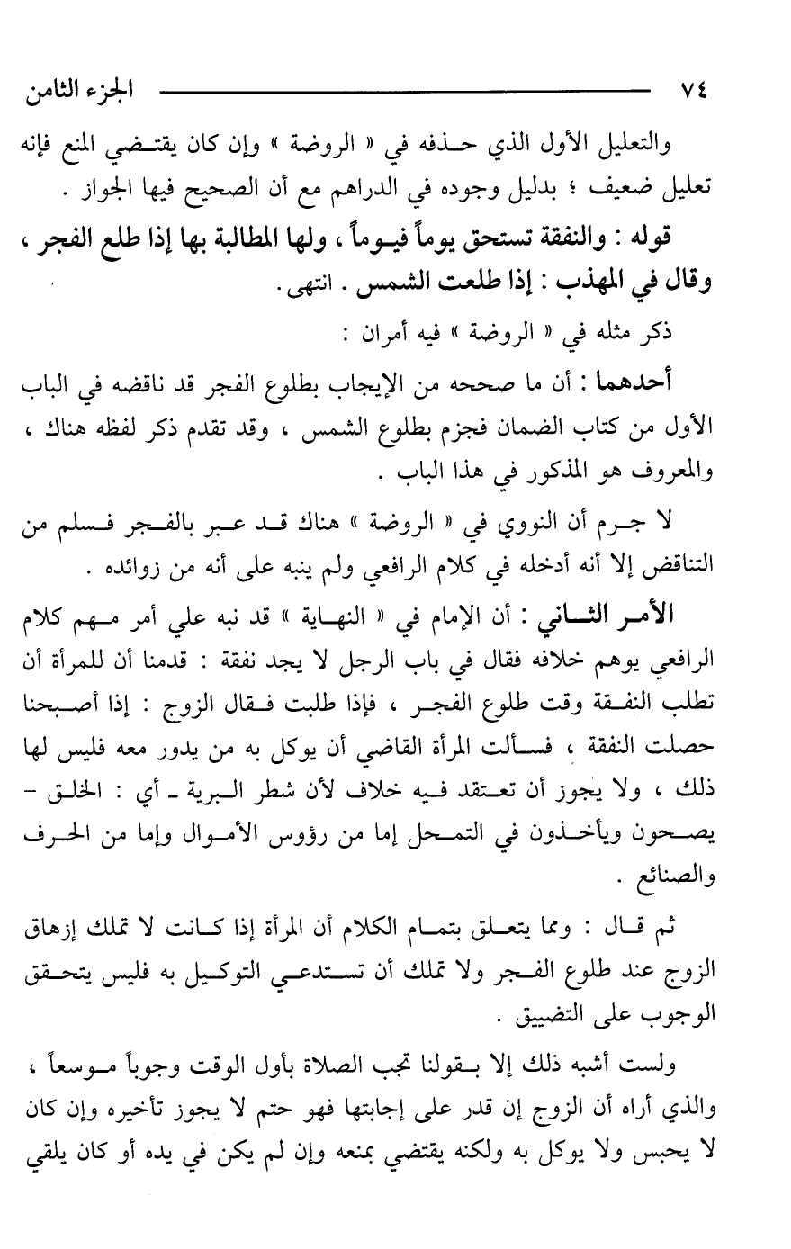 الأمر الثاني: أن الإمام في "النهاية" قد نبه علي أمر مهم كلام الرافعي يوهم خلافه فقال في باب الرجل لا يجد نفقة: قدمنا أن للمرأة أن تطلب النفقة وقت طلوع الفجر، فإذا طلبت فقال الزوج: إذا أصبحنا حصلت النفقة، فسألت المرأة القاضي أن يوكل به من يدور معه فليس لها ذلك، ولا يجوز أن تعتقد فيه خلاف لأن شطر البرية -أي: الخلق- يصحون ويأخذون في التمحل إما من رؤوس الأموال وإما من الحرف والصنائع.