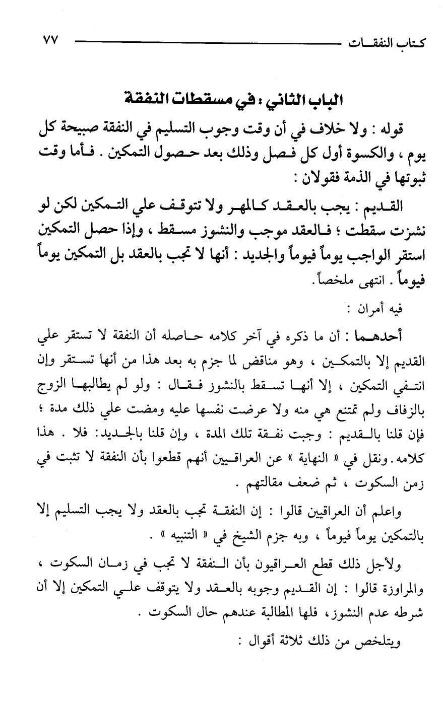 ولأجل ذلك قطع العراقيون بأن النفقة لا تجب في زمان السكوت، والمراوزة قالوا: إن القديم وجوبه بالعقد ولا يتوقف علي التمكين إلا أن شرطه عدم النشوز، فلها المطالبة عندهم حال السكوت.