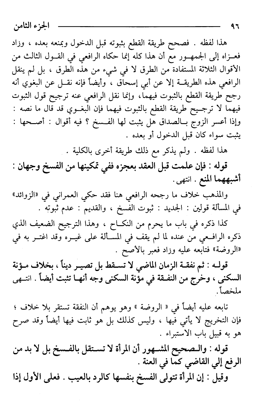 هذا لفظه. فصحح طريقة القطع بثبوته قبل الدخول وبمنعه بعده، وزاد فعزاه إلى الجمهور مع أن هذا كله إنما حكاه الرافعي في القول الثالث من الأقوال الثلاثة المستفادة من الطرق لا في شيء من هذه الطرق، بل لم ينقل الرافعي هذه الطريقة إلا عن أبي إسحاق، وأيضا فإنه نقل عن البغوي أنه رجح طريقة القطع بالثبوت فيهما، وإنما نقل الرافعي عنه ترجيح قول الثبوت فيهما لا ترجيح طريقة القطع بالثبوت فيهما فإن البغوي قد قال ما نصه: وإذا أعسر الزوج بالصداق هل يثبت لها الفسخ؟ فيه أقوال: أصحها: يثبت سواء كان قبل الدخول أو بعده.