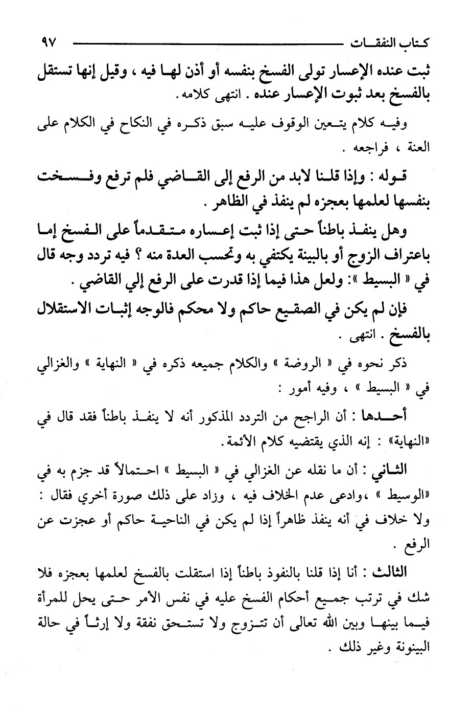 وهل ينفذ باطنًا حتى إذا ثبت إعساره متقدمًا على الفسخ إما باعتراف الزوج أو بالبينة يكتفي به وتحسب العدة منه؟ فيه تردد وجه قال في "البسيط": ولعل هذا فيما إذا قدرت على الرفع إلي القاضي.