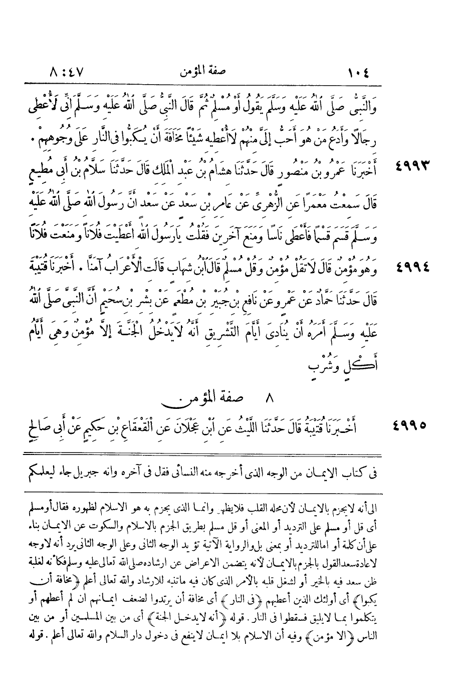 فِي كِتَابِ الْإِيمَانِ مِنَ الْوَجْهِ الَّذِي أَخْرَجَهُ مِنْهُ النَّسَائِيّ فَقل فِي آخِرِهِ وَإنَّهُ جِبْرِيلُ جَاءَ لِيُعَلِّمَكُمْ