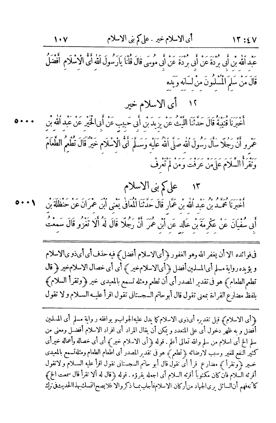 [5000] أَيُّ الْإِسْلَامِ خَيْرٌ أَيْ أَيُّ خِصَالِ الْإِسْلَامِ خير قَالَ تطعم الطَّعَام هُوَ فِي تَقْدِيرِ الْمَصْدَرِ أَيْ أَنْ تُطْعِمَ وَمِثْلُهُ تَسْمَعُ بِالْمُعَيْدِيِّ خَيْرٌ وَتَقْرَأُ السَّلَامَ بِلَفْظِ مُضَارِعِ الْقِرَاءَةِ بِمَعْنَى تَقُولُ قَالَ أَبُو حَاتِمٍ السِّجِسْتَانِيُّ تَقُولُ اقْرَأْ عَلَيْهِ السَّلَامَ ولَا تَقُولُ أَقْرِئْهُ السَّلَامَ فَإِذَا كَانَ مَكْتُوبًا قُلْتَ أَقْرِئْهُ السَّلَامَ أَيِ اجْعَلْهُ يَقْرَؤُهُ