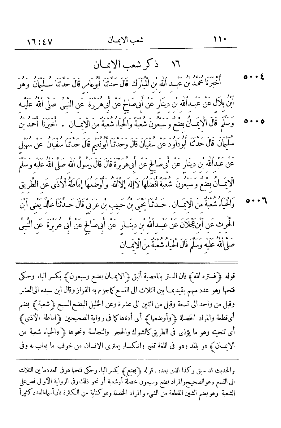 [5004] الْإِيمَانُ بِضْعٌ وَسَبْعُونَ بِكَسْرِ الْبَاءِ وَحُكِيَ فَتْحُهَا وَهُوَ عَدَدٌ مُبْهَمٌ يُقَيَّدُ بِمَا بَيْنَ الثَّلَاثِ إِلَى التِّسْعِ كَمَا جَزَمَ بِهِ الْقَزَّازُ وَقَالَ بن سِيدَهْ إِلَى الْعَشْرِ وَقِيلَ مِنْ وَاحِدٍ إِلَى تِسْعَةٍ وَقِيلَ مِنِ اثْنَيْنِ إِلَى عَشَرَةٍ وَعَنِ الْخَلِيل الْبضْع السَّبع شُعْبَة بِضَمٍّ أَيْ قِطْعَةٌ وَالْمُرَادُ الْخَصْلَةُ وَأَوْضَعُهَا أَيْ أَدْنَاهَا كَمَا فِي رِوَايَةِ الصَّحِيحَيْنِ إِمَاطَةُ الْأَذَى أَيْ تَنْحِيَتُهُ وَهُوَ مَا يُؤْذِي فِي الطَّرِيقِ كَالشَّوْكِ وَالْحَجَرِ وَالنِّجَاسَةِ وَنَحْوِهَا وَالْحَيَاءُ شُعْبَةٌ مِنَ الْإِيمَانِ هُوَ بِالْمَدِّ وَهُوَ فِي اللُّغَةِ تَغَيُّرٌ وَانْكِسَارٌ يَعْتَرِي الْإِنْسَانَ مِنْ خَوْفِ مَا يُعَابُ بِهِ وَفِي