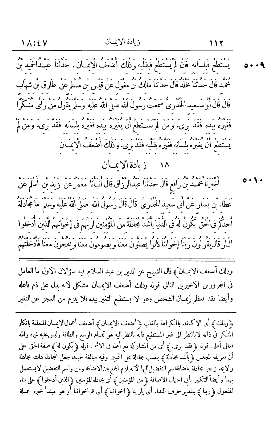 وَذَلِكَ أَضْعَفُ الْإِيمَانِ قَالَ الشَّيْخُ عِزُّ الدِّينِ بْنُ عَبْدِ السَّلَامِ فِيهِ سُؤَالَانِ الْأَوَّلُ مَا الْعَامِلُ فِي الْمَجْرُورَيْنِ الْأَخِيرَيْنِ الثَّانِي قَوْلُهُ وَذَلِكَ أَضْعَفُ الْإِيمَانِ مُشْكِلٌ لِأَنَّهُ يَدُلُّ عَلَى ذَمِّ فَاعِلِهِ وَأَيْضًا فَقَدْ يَعْظُمُ إِيمَانُ الشَّخْصِ وَهُوَ لَا يَسْتَطِيع التَّغَيُّر بِيَدِهِ فَلَا يلْزم من الْعَجز عَن التَّغَيُّر