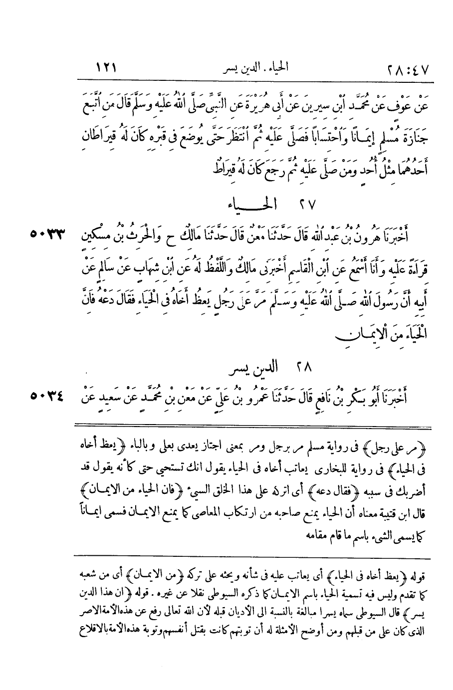 [5033] مَرَّ عَلَى رَجُلٍ فِي رِوَايَةِ مُسْلِمٍ مَرَّ بِرَجُل وَمر بِمَعْنَى اجْتَازَ يُعَدَّى بِعَلَى وَبِالْبَاءِ يَعِظُ أَخَاهُ فِي الْحَيَاءِ فِي رِوَايَةٍ لِلْبُخَارِيِّ يُعَاتِبُ أَخَاهُ فِي الْحيَاء يَقُول أَنَّك تَسْتَحي حَتَّى كَأَنَّهُ يَقُول قد أضربك فِي سَبَبِهِ فَقَالَ دَعْهُ أَيِ اُتْرُكْهُ عَلَى هَذَا الْخُلُقِ السَّيِّئِ فَإِنَّ الْحَيَاءَ مِنَ الْإِيمَانِ قَالَ بن قُتَيْبَةَ مَعْنَاهُ أَنَّ الْحَيَاءَ يَمْنَعُ صَاحِبَهُ مِنِ ارْتِكَابِ الْمَعَاصِي كَمَا يَمْنَعُ الْإِيمَانُ فَسُمِّيَ إِيمَانًا كَمَا يُسَمَّى الشَّيْءُ بِاسْمِ مَا قَامَ مَقَامَهُ