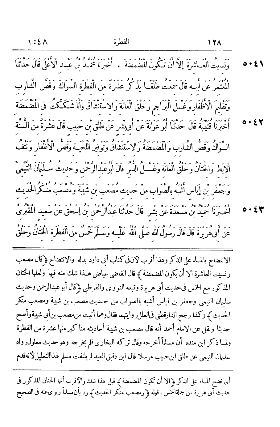 [5042] قَالَ أَبُو عَبْدِ الرَّحْمَنِ وَحَدِيثُ سُلَيْمَانَ التَّيْمِيِّ وَجَعْفَرِ بْنِ إِيَاسٍ أَشْبَهُ بِالصَّوَابِ مِنْ حَدِيثِ مُصعب بن شيبَة وَمصْعَب مُنكر الحَدِيث وَكَذَا رَجَّحَ الدَّارَقُطْنِيُّ فِي الْعِلَلِ رِوَايَتَهُمَا فَقَالَ وَهُمَا أَثْبَتُ مِنْ مُصْعَبِ بْنِ أَبِي شَيْبَةَ وَأَصَحُّ حَدِيثًا وَنُقِلَ عَنِ الْإِمَامِ أَحْمَدَ أَنَّهُ قَالَ مُصْعَبُ بْنُ شَيْبَةَ أَحَادِيثُهُ مَنَاكِيرُ مِنْهَا عَشَرَةٌ من الْفطْرَة وَلما ذكر بن مَنْدَهْ أَنَّ مُسْلِمًا أَخْرَجَهُ وَقَالَ تَرَكَهُ الْبُخَارِيُّ فَلَمْ يُخَرِّجْهُ وَهُوَ حَدِيثٌ مَعْلُولٌ رَوَاهُ سُلَيْمَانُ التَّيْمِيُّ عَنْ طَلْقِ بْنِ حَبِيبٍ مُرْسَلًا قَالَ بن دَقِيقِ الْعِيدِ لَمْ يَلْتَفِتْ مُسْلِمٌ لِهَذَا التَّعْلِيلِ لِأَنَّهُ قدم