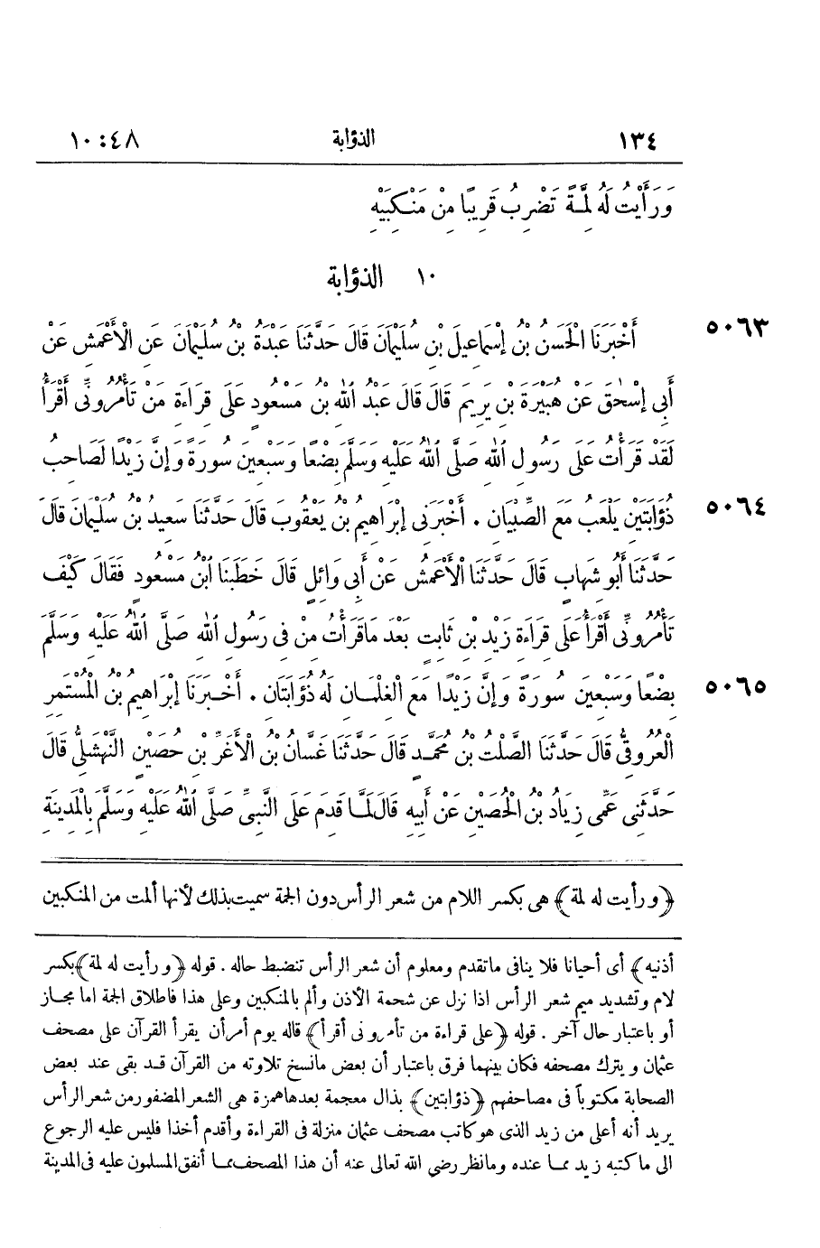 [5063] على قِرَاءَة من تأمروني أَقرَأ قَالَه يَوْم أَمر أَن يقْرَأ الْقُرْآن على مصحف عُثْمَان وَيتْرك مصحفه فَكَانَ بَينهمَا فرق بِاعْتِبَار أَن بعض مَا نسخ تِلَاوَته من الْقُرْآن قد بَقِي عِنْد بعض الصَّحَابَة مَكْتُوبًا فِي مصاحفهم ذؤابتين بذال مُعْجمَة بعْدهَا همزَة هِيَ الشّعْر المضفور من شعر الراس يُرِيد أَنه أَعلَى من زيد الَّذِي هُوَ كَاتب مصحف عُثْمَان منزلَة فِي الْقِرَاءَة وأقدم أخذا فَلَيْسَ عَلَيْهِ الرُّجُوع إِلَى مَا كتبه زيد مِمَّا عِنْده وَمَا نظر رضى الله تَعَالَى عَنهُ أَن هَذَا الْمُصحف مِمَّا أنْفق الْمُسلمُونَ عَلَيْهِ فِي الْمَدِينَة قَوْله ادن من الدنو بِمَعْنى الْقرب وسمت من التَّسْمِيَة بِمَعْنى الدُّعَاء وَمَا بعده من عطف التَّفْسِير لَهُ قَوْله