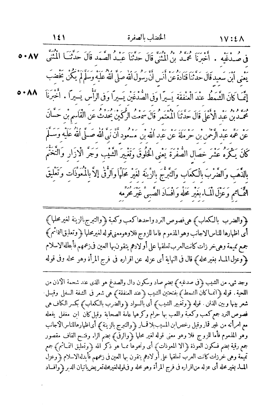 [5088] وتغيير الشيب أَي بِالسَّوَادِ وَالضَّرْب بالكعاب بِكَسْر الْكَاف هِيَ فصوص النَّرْد جمع كَعْب وكعبة واللعب بهَا حرَام وكرهها عَامَّة الصَّحَابَة وَقيل كَانَ بن مُغفل يَفْعَله مَعَ امْرَأَته من غير قمار وَقيل رخص بن الْمسيب بِلَا قمار والتبرج بالزينة أَيْ إِظْهَارُهَا لِلنَّاسِ الْأَجَانِبِ وَهُوَ الْمَذْمُومُ فَأَمَّا لِلزَّوْجِ فَلَا وَهُوَ مَعْنَى قَوْلِهِ لِغَيْرِ مَحَلِّهَا والرقى بِضَم الرَّاء وَفتح الْقَاف مَقْصُور جمع رقية بِضَم فَسُكُون العوذة الا المعوذات أَي وَنَحْوهَا مِمَّا هُوَ ذكر الله وَتَعْلِيقَ التَّمَائِمِ جَمْعُ تَمِيمَةٍ وَهِيَ خَرَزَاتٌ كَانَتِ الْعَرَبُ تُعَلِّقُهَا عَلَى أَوْلَادِهِمْ يَتَّقُونَ بِهَا الْعَيْنَ فِي زعمهم فأبدله الْإِسْلَام وعزل المَاء بِغَيْر مَحَله أَي عَزله من إِقْرَارِهِ فِي فَرْجِ الْمَرْأَةِ وَهُوَ مَحَلُّهُ وَفِي قَوْله لغير مَحَلِّهِ تَعْرِيضٌ بِإِتْيَانِ الدُّبُرِ وَإِفْسَادَ
