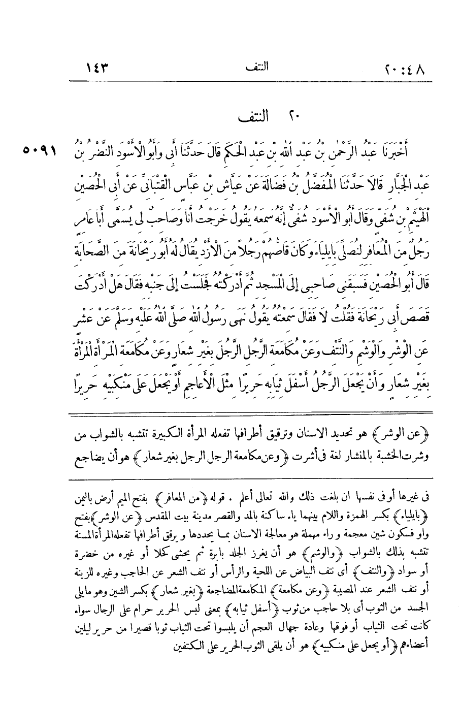 [5091] من المعافر بِفَتْح الْمِيم أَرض بِالْيمن بايلياء بِكَسْر الْهمزَة وَاللَّام بَينهمَا يَاء سَاكِنة بِالْمدِّ وَالْقصر مَدِينَة بَيت الْمُقَدّس عَن الوشر بِفَتْح وَاو فَسُكُون شين مُعْجمَة وَرَاء مُهْملَة هُوَ معالجة الْأَسْنَان بِمَا يحددها ويرقق أطرافها تَفْعَلهُ الْمَرْأَة المسنة تتشبه بذلك بالشواب والوشم هُوَ أَن يغرز الْجلد بابرة ثمَّ يحشى كحلا أَو غَيره من خضرَة أَو سَواد والنتف أَي نتف الْبيَاض عَن اللِّحْيَة وَالرَّأْس أَو نتف الشّعْر عَن الْحَاجِب وَغَيره للزِّينَة أَو نتف الشّعْر عِنْد الْمُصِيبَة وَعَن مكامعة المكامعة المضاجعة بِغَيْر شعار بِكَسْر الشين وَهُوَ مَا يَلِي الْجَسَد من الثَّوْب أَي بِلَا حَاجِب من ثوب أَسْفَل ثِيَابه بِمَعْنى لبس الْحَرِير حرَام على الرِّجَال سَوَاء كَانَت تَحت الثِّيَاب أَو فَوْقهَا وَعَادَة جهال الْعَجم أَن يلبسوا تَحت الثِّيَاب ثوبا قَصِيرا من حَرِير ليلين أعضاءهم أَو يَجْعَل على مَنْكِبَيْه هُوَ أَن يلقِي الثَّوْب الْحَرِير على الْكَتِفَيْنِ