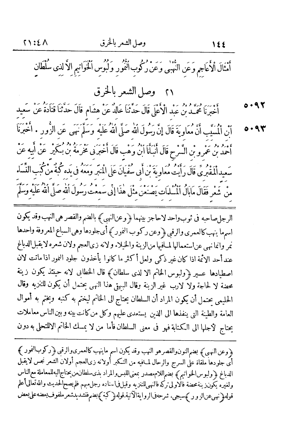 الرَّجُلُ صَاحِبَهُ فِي ثَوْبٍ وَاحِدٍ لَا حَاجِزَ بَيْنَهُمَا وَعَنْ النُّهْبَى بِالضَّمِّ وَالْقَصْرِ هِيَ النَّهْبُ وَقَدْ يَكُونُ اسْمَ مَا يُنْهَبُ كَالْعُمْرَى وَالرُّقْبَى وَعَنْ رُكُوبِ النُّمُورِ أَيْ جُلُودُهَا وَهِيَ السِّبَاعُ الْمَعْرُوفَةُ وَاحِدُهَا نَمِرٌ وَإِنَّمَا نَهَى عَنِ اسْتِعْمَالِهَا لِمَا فِيهَا مِنَ الزِّينَةِ وَالْخُيَلَاء وَلِأَنَّهُ زِيُّ الْعَجَمِ وَلِأَنَّ شَعْرَهُ لَا يَقْبَلُ الدِّبَاغَ عِنْدَ أَحَدِ الْأَئِمَّةِ إِذَا كَانَ غَيْرَ ذَكِيٍّ وَلَعَلَّ أَكْثَرَ مَا كَانُوا يَأْخُذُونَ جُلُودَ النُّمُورِ إِذَا مَاتَت لِأَن اصطيادها عسير ولبوس الْخَاتم إِلَّا لِذِي سُلْطَانٍ قَالَ الْخَطَّابِيُّ لِأَنَّهُ حِينَئِذٍ يَكُونُ زِينَةً مَحْضَةً لَا لِحَاجَةٍ وَلَا لِأَرَبٍ غَيْرِ الزِّينَةِ وَقَالَ الْبَيْهَقِيُّ هَذَا النَّهْيُ يُحْتَمَلُ أَنْ يَكُونَ لِلتَّنْزِيهِ وَقَالَ الْحَلِيمِيُّ يُحْتَمَلُ أَنْ يَكُونَ الْمُرَادُ أَنَّ السُّلْطَانَ يَحْتَاجُ إِلَى الْخَاتَمِ لِيَخْتِمَ بِهِ كُتُبَهُ وَيَخْتِمَ بِهِ أَمْوَالَ الْعَامَّةِ وَالطِّينَةِ الَّتِي يُنْفِذُهَا إِلَى الَّذِينَ يَسْتَعْدِي عَلَيْهِمْ وَكُلُّ مَنْ كَانَتْ بَيْنَهُ وَبَيْنَ النَّاسِ مُعَامَلَاتٌ يَحْتَاجُ لِأَجْلِهَا إِلَى الْكِتَابَةِ فَهُوَ فِي مَعْنَى السُّلْطَانِ فَأَمَّا مَنْ لَا يُمْسِكُ الْخَاتَمَ إِلَّا لِلتَّحَلِّي بِهِ دُونَ