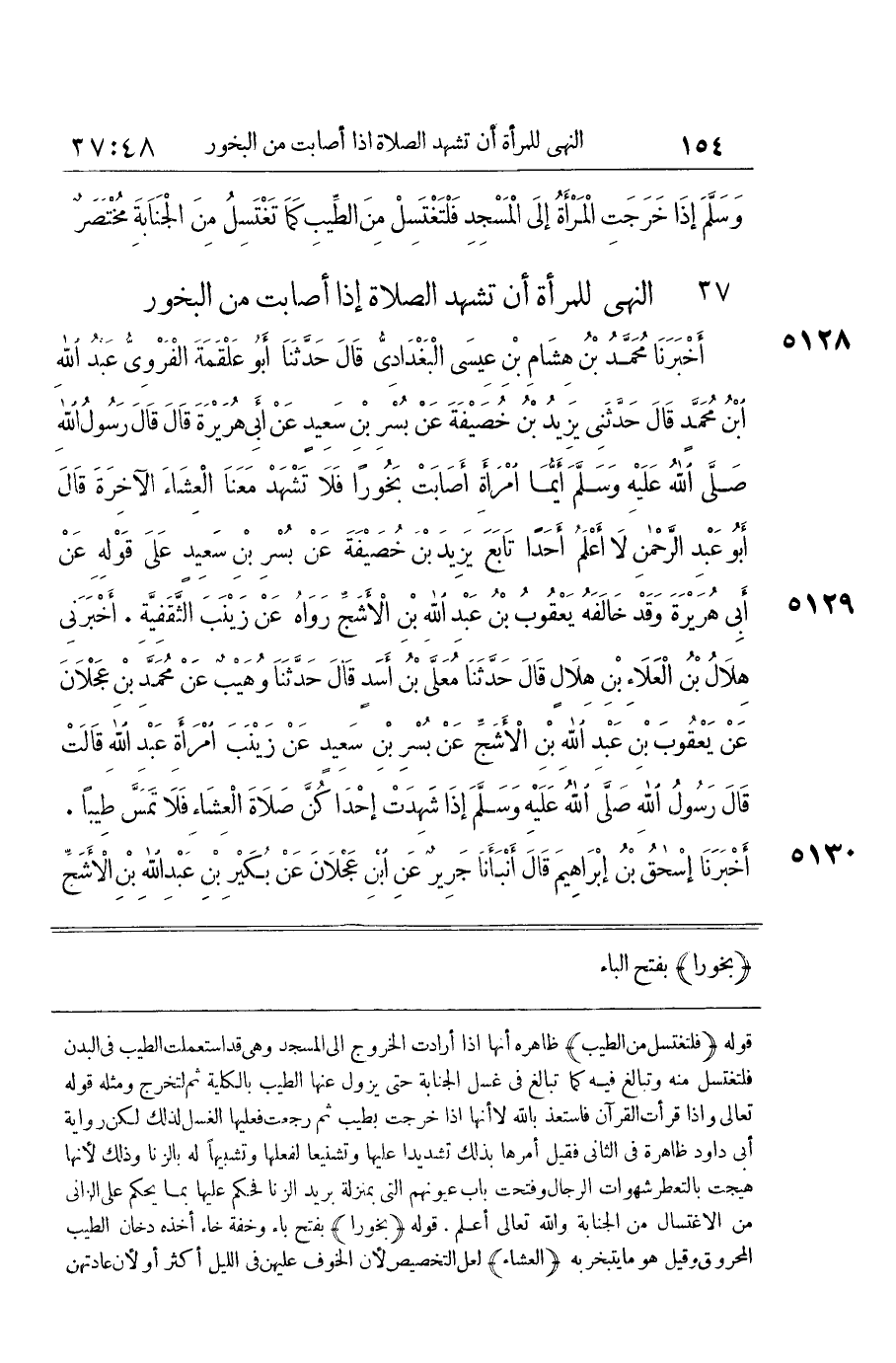 فلتغتسل مِنْهُ وتبالغ فِيهِ كَمَا تبالغ فِي غسل الْجَنَابَة حَتَّى يَزُول عَنْهَا الطّيب بِالْكُلِّيَّةِ ثمَّ لتخرج وَمثله قَوْله تَعَالَى وَإِذا قَرَأت الْقُرْآن فاستعذ بِاللَّه لَا أَنَّهَا إِذا خرجت بِطيب ثمَّ رجعت فعلَيْهَا الْغسْل لذَلِك لَكِن رِوَايَة أبي دَاوُد ظَاهِرَة فِي الثَّانِي فَقيل أمرهَا بذلك تشديدا عَلَيْهَا وتشنيعا لفعلها وتشبيها لَهُ بالزنى وَذَلِكَ لِأَنَّهَا هيجت بالتعطر شهوات الرِّجَال وَفتحت بَاب عيونهم الَّتِي بِمَنْزِلَة بريد الزِّنَى فَحكم عَلَيْهَا بِمَا يحكم على الزَّانِي من الِاغْتِسَال من الْجَنَابَة وَالله تَعَالَى أعلم قَوْله بخورا بِفَتْح بَاء وخفة خاء أَخذه دُخان الطّيب المحروق وَقيل هُوَ مَا يتبخر بِهِ الْعشَاء لَعَلَّ التَّخْصِيص لِأَن الْخَوْف عَلَيْهِنَّ فِي اللَّيْل أَكثر أَو لِأَن عادتهن