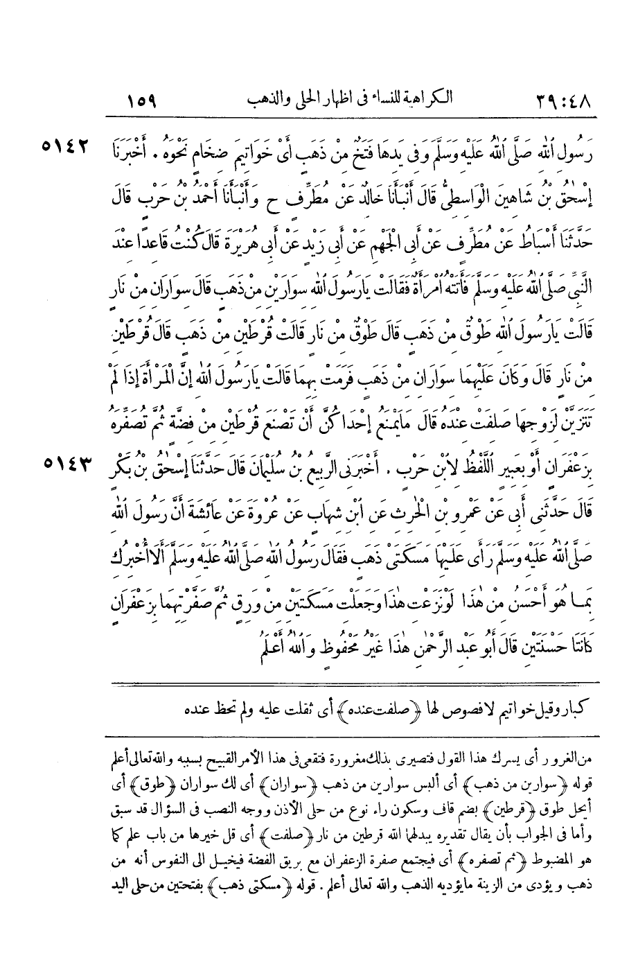 [5142] سِوَارَيْنِ من ذهب أَي ألبس سِوَارَيْنِ من ذهب سواران أَي لَك سواران طوق أَي أَيحلُّ طوق قرطين بِضَم قَاف وَسُكُون رَاء نوع من حلى الْأذن وَوجه النصب فِي السُّؤَال قد سبق وَأما فِي الْجَواب بِأَن يُقَال تَقْدِيره يبدلهما الله قرطين من نَار صلفت أَي قل خَيرهَا من بَاب علم كَمَا هُوَ المضبوط ثمَّ تصفره أَي فيجتمع صفرَة الزَّعْفَرَان مَعَ بريق الْفضة فيخيل إِلَى النُّفُوس أَنه من ذهب وَيُؤَدِّي من الزِّينَة مَا يُؤَدِّيه الذَّهَب وَالله تَعَالَى أعلم