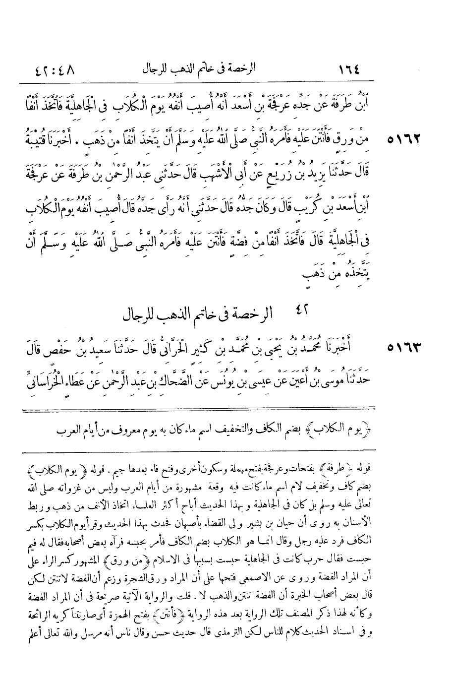 قَوْله طرفَة بِفَتَحَات وعرفجة بِفَتْح مُهْملَة وَسُكُون أُخْرَى وَفتح فَاء بعْدهَا جِيم قَوْله يَوْم الْكلاب بِضَم كَاف وَتَخْفِيف لَام اسْم مَاء كَانَت فِيهِ وقْعَة مَشْهُورَة من أَيَّام الْعَرَب وَلَيْسَ من غَزَوَاته صلى الله تَعَالَى عَلَيْهِ وَسلم بل كَانَ فِي الْجَاهِلِيَّة وَبِهَذَا الحَدِيث أَبَاحَ أَكثر الْعلمَاء اتِّخَاذ الْأنف من ذهب وربط الْأَسْنَان بِهِ روى أَن حَيَّان بن بشير ولى الْقَضَاء بأصبهان فَحدث بِهَذَا الحَدِيث وَقَرَأَ يَوْم الْكلاب بِكَسْر الْكَاف فَرد عَلَيْهِ رجل وَقَالَ انما هُوَ الْكلاب بِضَم الْكَاف فَأمر بحبسه فَرَآهُ بعض أَصْحَابه فَقَالَ لَهُ فيمَ حبست فَقَالَ حَرْب كَانَت فِي الْجَاهِلِيَّة حبست بِسَبَبِهَا فِي الْإِسْلَام من ورق الْمَشْهُور كسر الرَّاء على أَن المُرَاد الْفضة وروى عَن الْأَصْمَعِي فتحهَا على أَن المُرَاد ورق الشَّجَرَة وَزعم أَن الْفضة لَا تنتن لَكِن قَالَ بعض أَصْحَاب الْخِبْرَة أَن الْفضة تنتن وَالذَّهَب لَا قلت وَالرِّوَايَة الْآتِيَة صَرِيحَة فِي أَن المُرَاد الْفضة وَكَأَنَّهُ لهَذَا ذكر المُصَنّف تِلْكَ الرِّوَايَة بعد هَذِه الرِّوَايَة فَأَنْتن بِفَتْح الْهمزَة أَي صَار نَتنًا كريه الرَّائِحَة وَفِي إِسْنَاد الحَدِيث كَلَام للنَّاس لَكِن التِّرْمِذِيّ قَالَ حَدِيث حسن وَقَالَ نَاس انه مُرْسل وَالله تَعَالَى أعلم