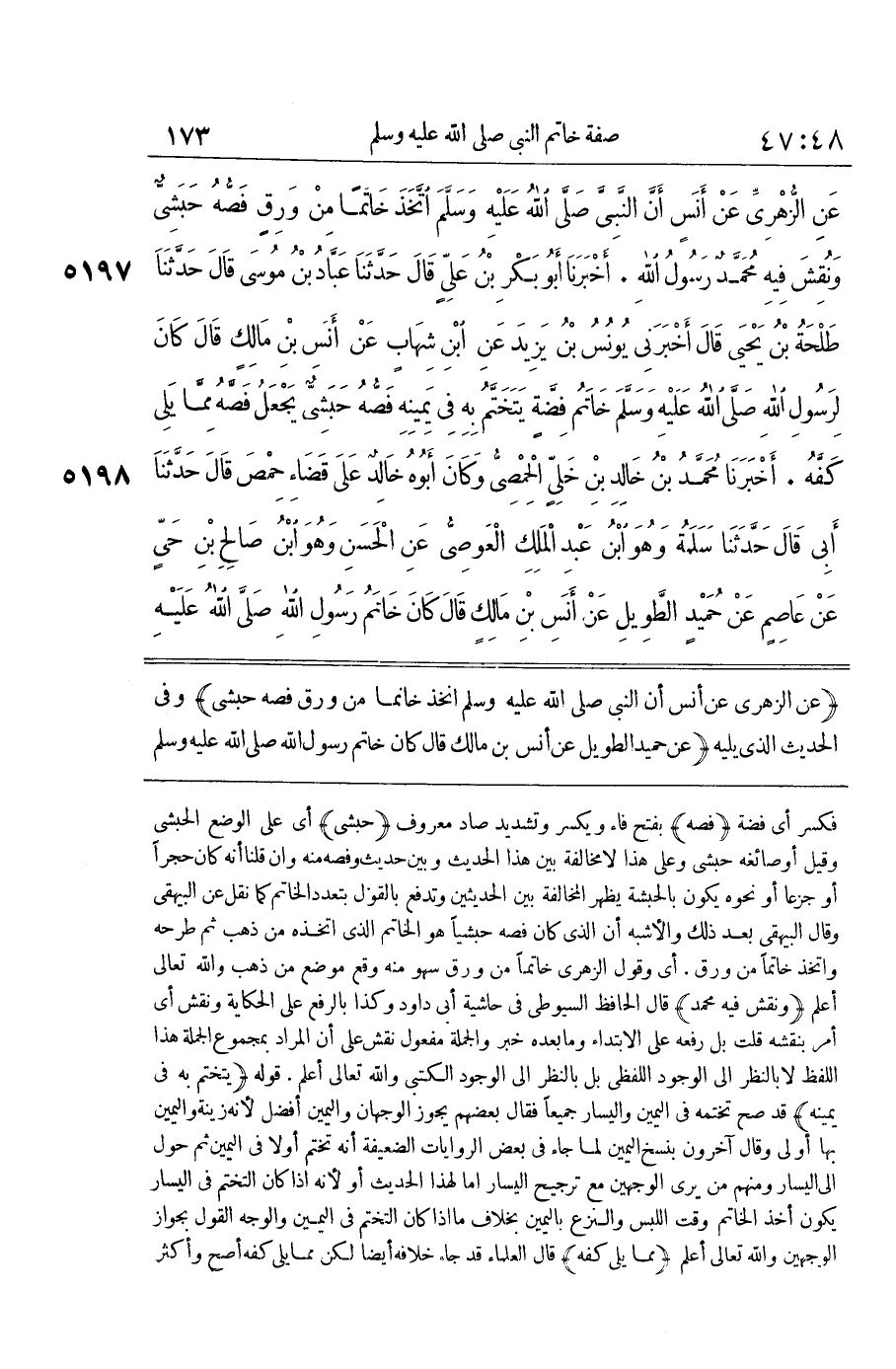 [5198] عَنْ حُمَيْدٍ الطَّوِيلِ عَنْ أَنَسِ بْنِ مَالِكٍ قَالَ كَانَ خَاتَمُ رَسُولِ اللَّهِ صَلَّى اللَّهُ عَلَيْهِ وَسَلَّمَ مِنْ فِضَّةٍ وَكَانَ فَصُّهُ مِنْهُ قَالَ الْبَيْهَقِيُّ هَذَا يَدُلُّ عَلَى أَنَّهُ كَانَ لَهُ خَاتَمَانِ أَحَدُهُمَا فَصُّهُ حَبَشِيٌّ وَالْآخَرُ فَصُّهُ مِنْهُ إِنْ كَانَ الزُّهْرِيُّ حَفِظَ فِي حَدِيثِهِ مِنْ وَرِقٍ وَالْأَشْبَهُ بِسَائِرِ الرِّوَايَاتِ أَنَّ الَّذِي كَانَ فَصُّهُ حَبَشِيًّا هُوَ الْخَاتَمُ الَّذِي اتَّخَذَهُ مِنْ ذَهَبٍ ثُمَّ طَرَحَهُ وَاتَّخَذَ خَاتَمًا مِنْ وَرِقٍ قَالَ فِي النِّهَايَةِ وَقَوْلُهُ حَبَشِيٌّ يَحْتَمِلُ أَنَّهُ أَرَادَ مِنَ الْجَزْعِ أَوِ الْعَقِيقِ لِأَنَّ مَعْدِنَهُمَا الْيَمَنُ وَالْحَبَشَةُ أَوْ نَوْعًا آخَرَ يُنْسَبُ إِلَيْهِمَا