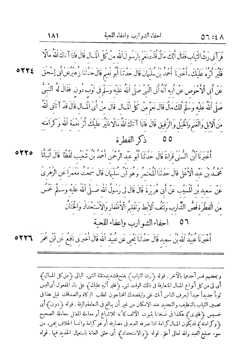 [5223] رث الثِّيَاب بِفَتْح فتشديد مُثَلّثَة الشَّيْء الْبَالِي من كل المَال أَي لي من كل أَنْوَاع المَال المتعارفة فِي ذَلِك الْوَقْت شَيْء فلير أَثَره عَلَيْك على بِنَاء الْمَفْعُول أَي البس ثوبا جَدِيدا جيدا ليعرف النَّاس أَنَّك غَنِي وليقصدك المحتاجون لطلب الزَّكَاة وَالصَّدقَات قيل هَذَا فِي تَحْسِين الثِّيَاب بالتنظيف والتجديد عِنْد الْإِمْكَان من غير أَن يُبَالغ فِي النعامة والرقة قَوْله دون أَي خسيس فليرى هَكَذَا فِي نسختنا بِثُبُوت الْألف كَأَنَّهُ للاشباع أَو مُعَاملَة المعتل مُعَاملَة الصَّحِيح وكرامته قد يكون المَال كَرَامَة إِذا صرفه العَبْد فِي مصارفه أَو هُوَ كَرَامَة وَإِنَّمَا الْخلاف يَجِيء من سوء صَنِيع العَبْد وَالله تَعَالَى أعلم قَوْله والاستحداد أَي حلق الْعَانَة بِاسْتِعْمَال الْحَدِيد فِيهَا قَوْله