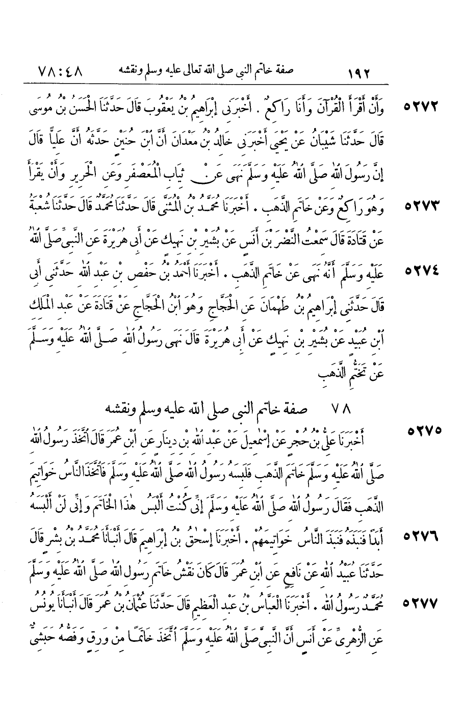 5276 - أَخْبَرَنَا إِسْحَقُ بْنُ إِبْرَاهِيمَ، قَالَ: أَنْبَأَنَا مُحَمَّدُ بْنُ بِشْرٍ، قَالَ: حَدَّثَنَا عُبَيْدُ اللَّهِ، عَنْ نَافِعٍ، عَنْ ابْنِ عُمَرَ قَالَ: «§كَانَ نَقْشُ خَاتَمِ رَسُولِ اللَّهِ صَلَّى اللهُ عَلَيْهِ وَسَلَّمَ مُحَمَّدٌ رَسُولُ اللَّهِ»