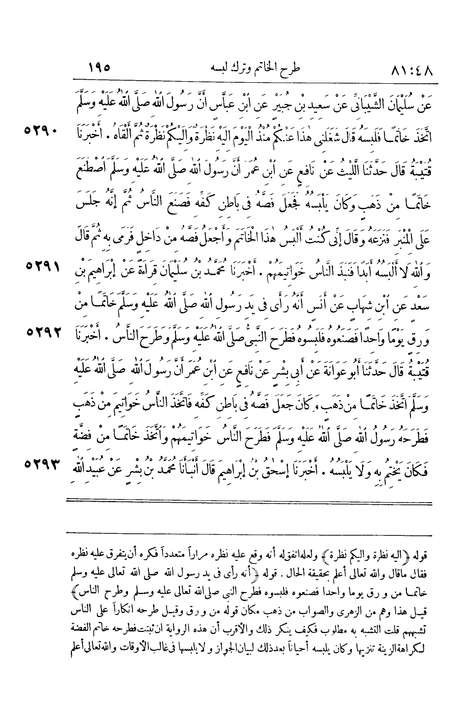 [5291] أَنَّهُ رَأَى فِي يَدِ رَسُولِ اللَّهِ صَلَّى الله تَعَالَى عَلَيْهِ وَسَلَّمَ خَاتَمًا مِنْ وَرِقٍ يَوْمًا وَاحِدًا فصنعوه فلبسوه فَطرح النَّبِي صلى الله تَعَالَى عَلَيْهِ وَسلم وَطرح النَّاس قيل هَذَا وهم من الزُّهْرِيّ وَالصَّوَاب من ذهب مَكَان قَوْله من ورق وَقيل طَرحه إنكارا على النَّاس تشبههم قلت التَّشَبُّه بِهِ مَطْلُوب فَكيف يُنكر ذَلِك وَالْأَقْرَب أَن هَذِه الرِّوَايَة ان ثبتَتْ فطرحه خَاتم الْفضة لكَرَاهَة الزِّينَة تَنْزِيها وَكَانَ يلْبسهُ أَحْيَانًا بعد ذَلِك لبَيَان الْجَوَاز وَلَا يلبسهَا فِي غَالب الْأَوْقَات وَالله تَعَالَى أعلم قَوْله