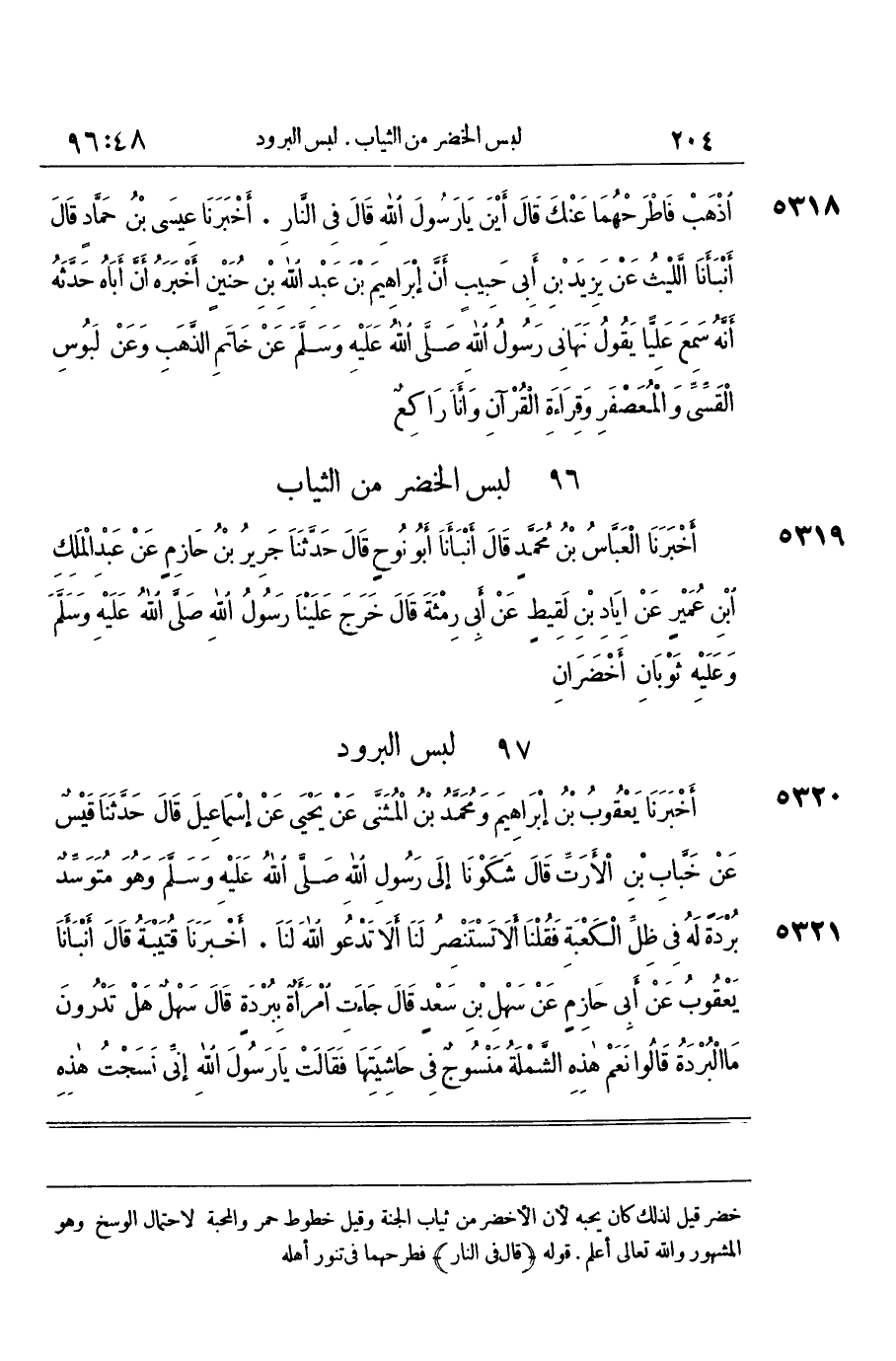 خضر قيل لذَلِك كَانَ يُحِبهُ لِأَن الْأَخْضَر من ثِيَاب الْجنَّة وَقيل خطوط حمر والمحبة لاحْتِمَال الْوَسخ وَهُوَ الْمَشْهُور وَالله تَعَالَى اعْلَم
