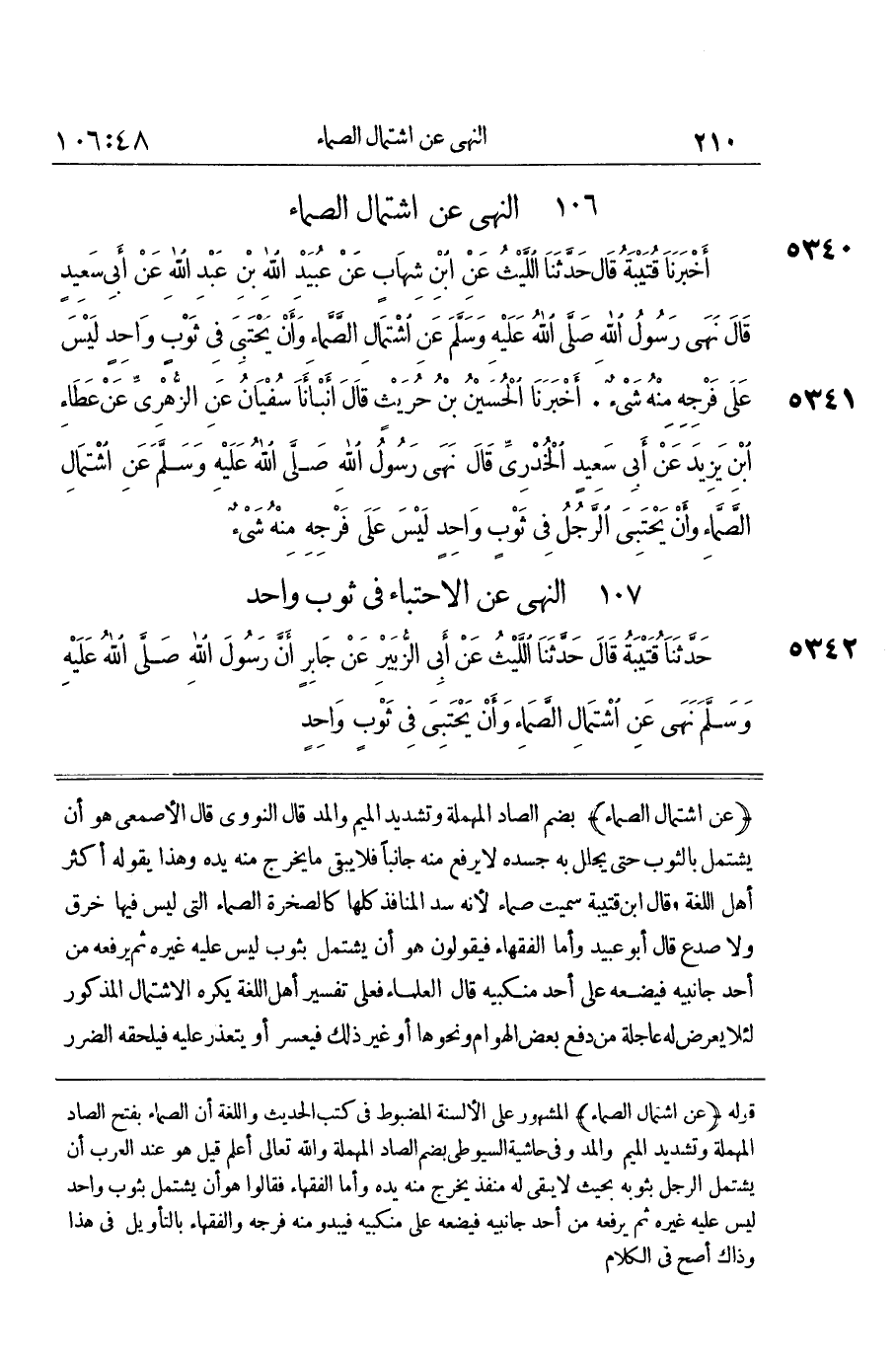 [5340] عَن اشْتِمَال الصماء الْمَشْهُور على الْأَلْسِنَة المضبوط فِي كتب الحَدِيث واللغة أَن الصَّمَّاءِ بِفَتْحِ الصَّادِ الْمُهْمَلَةِ وَتَشْدِيدِ الْمِيمِ وَالْمَدِّ وَفِي حَاشِيَة السُّيُوطِيّ بِضَم الصَّاد الْمُهْملَة وَالله تَعَالَى أعلم قيل هُوَ عِنْد الْعَرَب أَن يشْتَمل الرجل بِثَوْبِهِ بِحَيْثُ لَا يبْقى لَهُ منفذ يخرج مِنْهُ يَده وَأما الْفُقَهَاء فَقَالُوا هُوَ أَن يشْتَمل بِثَوْب وَاحِد لَيْسَ عَلَيْهِ غَيْرُهُ ثُمَّ يَرْفَعُهُ مِنْ أَحَدِ جانبيه فيضعه على مَنْكِبَيْه فيبدو مِنْهُ فرجه وَالْفُقَهَاء بالتأويل فِي هَذَا وَذَاكَ أصح فِي