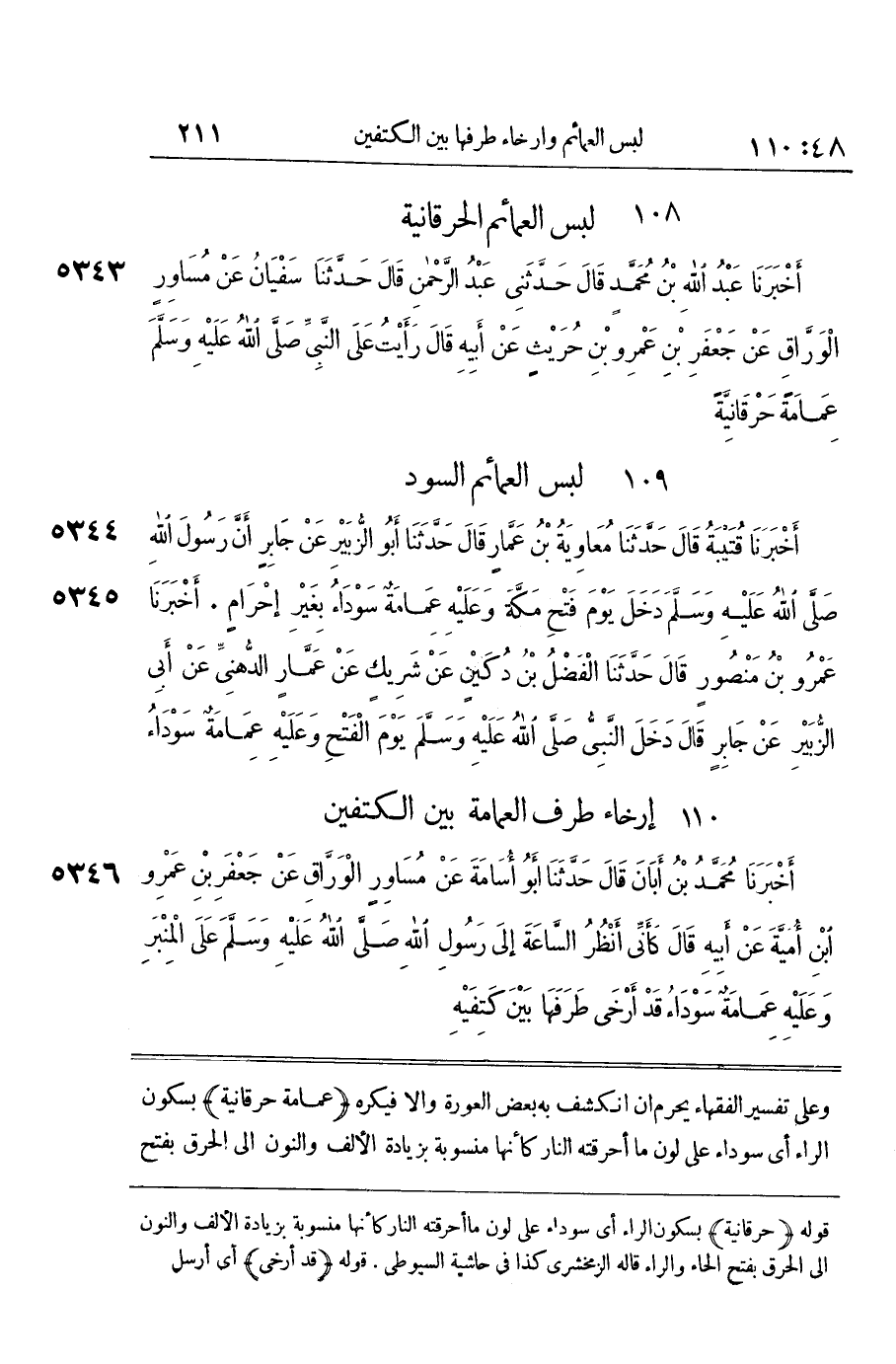 [5343] عِمَامَةً حَرْقَانِيَّةً بِسُكُونِ الرَّاءِ أَيْ سَوْدَاءَ عَلَى لَوْنِ مَا أَحْرَقَتْهُ النَّارُ كَأَنَّهَا مَنْسُوبَةٌ بِزِيَادَةِ الْأَلِفِ وَالنُّونِ إِلَى الْحَرَقِ بِفَتْحِ الْحَاءِ وَالرَّاءِ قَالَه الزَّمَخْشَرِيّ قِرَامًا بِكَسْرِ الْقَافِ هُوَ السِّتْرُ الرَّقِيقُ وَقِيلَ الصَّفِيقُ مِنْ صُوفِ ذِي أَلْوَانٍ وَقِيلَ السِّتْرُ الرَّقِيق وَرَاء السّتْر الغليظ سَهْوَةٍ بِفَتْحِ الْمُهْمَلَةِ بَيْتٌ صَغِيرٌ مُنْحَدِرٌ فِي الْأَرْضِ قَلِيلًا شَبَهُ الْمِخْدَعِ وَالْخِزَانَةِ وَقِيلَ كَالصُّفَّةِ يَكُونُ بَيْنَ يَدَيِ الْبَيْتِ وَقِيلَ شَبِيهٌ بِالرَّفِّ أَوِ الطاق يوضع فِيهِ الشَّيْء