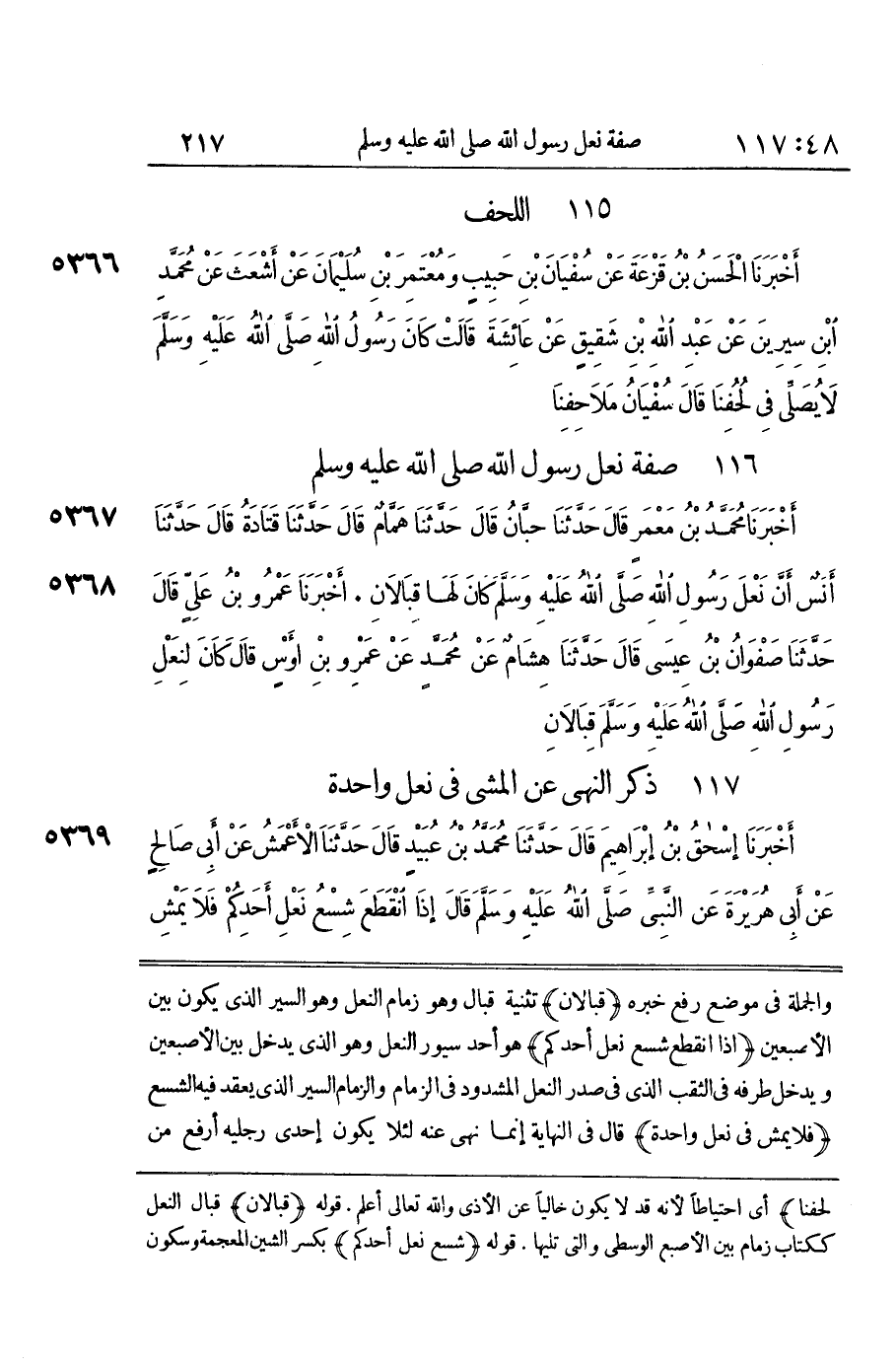 [5369] إِذَا انْقَطَعَ شِسْعُ نَعْلِ أَحَدِكُمْ هُوَ أَحَدُ سُيُورِ النَّعْلِ وَهُوَ الَّذِي يُدْخَلُ بَيْنَ الْأُصْبُعَيْنِ وَيُدْخَلُ طَرَفُهُ فِي الثُّقْبِ الَّذِي فِي صَدْرِ النَّعْلِ الْمَشْدُودِ فِي الزِّمَامِ وَالزِّمَامُ السَّيْرُ الَّذِي يُعْقَدُ فِيهِ الشِّسْعُ فَلَا يَمْشِ فِي نَعْلٍ وَاحِدَةٍ قَالَ فِي النِّهَايَةِ إِنَّمَا نَهَى عَنْهُ لِئَلَّا يَكُونَ إِحْدَى رِجْلَيْهِ أَرْفَعَ مِنَ الْأُخْرَى وَيَكُونُ سَبَبًا لِلْعِثَارِ وَيَقْبُحُ فِي الْمَنْظَرِ وَيُعَابُ فَاعله