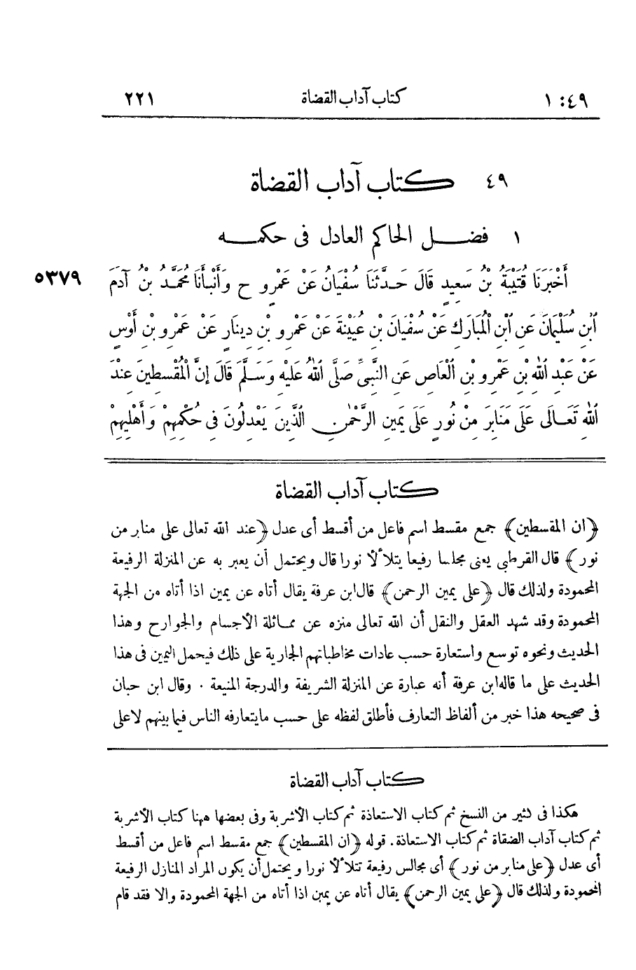[5379] إِنَّ الْمُقْسِطِينَ جَمْعُ مُقْسِطٍ اسْمُ فَاعِلٍ مِنْ أَقْسَطَ أَيْ عَدَلَ عِنْدَ اللَّهِ تَعَالَى عَلَى مَنَابِرَ مِنْ نُورٍ قَالَ الْقُرْطُبِيُّ يَعْنِي مَجْلِسًا رَفِيعًا يَتَلَأْلَأُ نُورًا قَالَ وَيُحْتَمَلُ أَنْ يُعَبَّرَ بِهِ عَنِ الْمَنْزِلَةِ الرَّفِيعَةِ الْمَحْمُودَةِ وَلِذَلِكَ قَالَ على يَمِين الرَّحْمَن قَالَ بن عَرَفَةَ يُقَالُ أَتَاهُ عَنْ يَمِينٍ إِذَا أَتَاهُ مِنَ الْجِهَةِ الْمَحْمُودَةِ وَقَدْ شَهِدَ الْعَقْلُ وَالنَّقْلُ أَنَّ اللَّهَ تَعَالَى مُنَزَّهٌ عَنْ مُمَاثَلَةِ الْأَجْسَامِ وَالْجَوَارِحِ وَهَذَا الْحَدِيثُ وَنَحْوُهُ تَوَسُّعٌ وَاسْتِعَارَةٌ حَسْبَ عَادَاتِ مُخَاطَبَاتِهِمُ الْجَارِيَةِ عَلَى ذَلِكَ فَيُحْمَلُ الْيَمِينُ فِي هَذَا الحَدِيث على مَا قَالَه بن عَرَفَةَ أَنَّهُ عِبَارَةٌ عَنِ الْمَنْزِلَةِ الشَّرِيفَةِ وَالدَّرَجَةِ المنيعة وَقَالَ بن حِبَّانَ فِي صَحِيحِهِ هَذَا خَبَرٌ مِنْ أَلْفَاظِ التَّعَارُفِ فَأُطْلِقَ لَفْظُهُ عَلَى حَسَبِ مَا يَتَعَارَفُهُ النَّاسُ فِيمَا بَيْنَهُمْ لَا عَلَى
