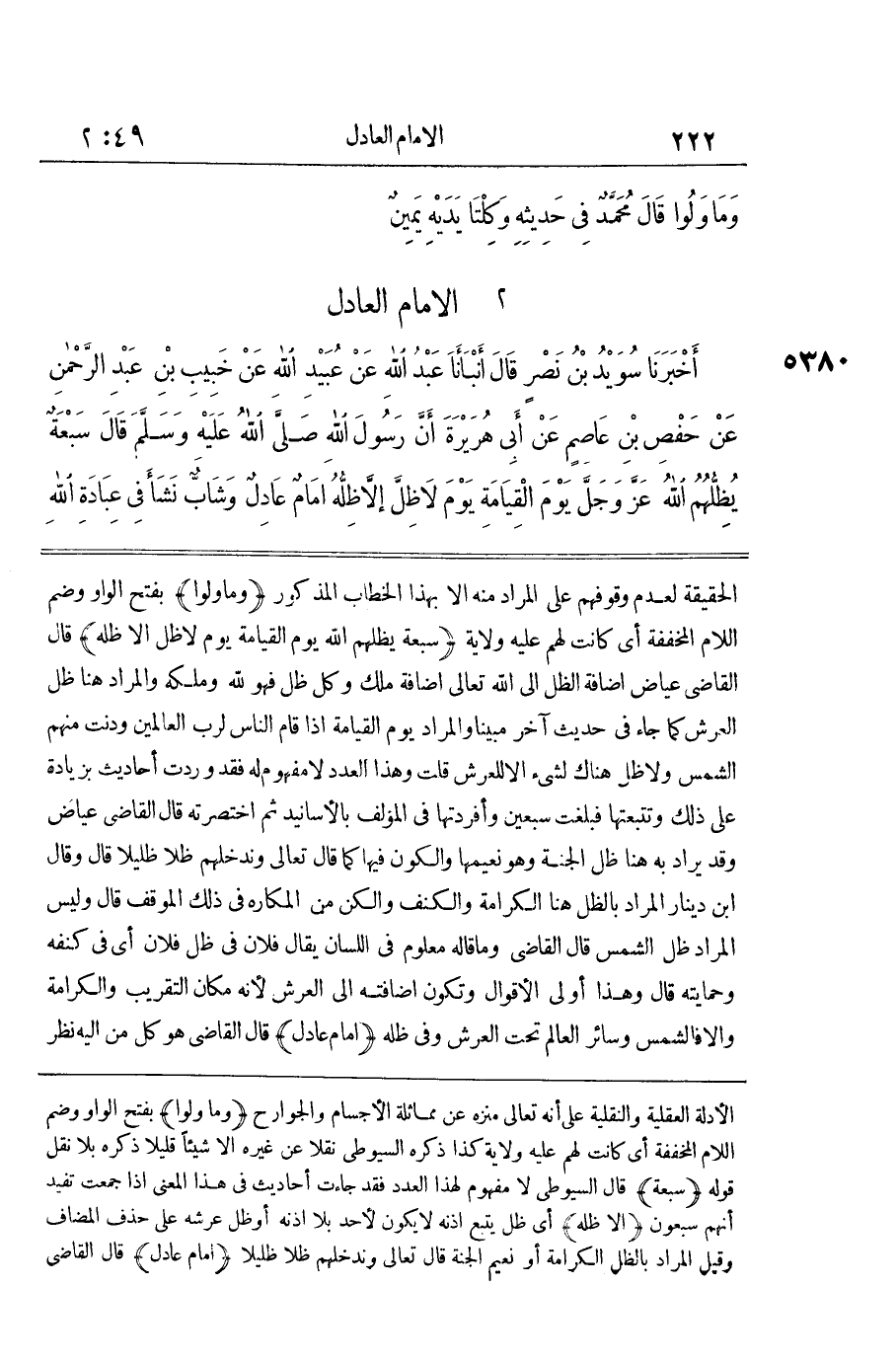 [5380] سَبْعَةٌ يُظِلُّهُمُ اللَّهُ يَوْمَ الْقِيَامَةِ يَوْمَ لَا ظِلَّ إِلَّا ظِلُّهُ قَالَ الْقَاضِي عِيَاضٌ إِضَافَةُ الظِّلِّ إِلَى اللَّهِ تَعَالَى إِضَافَةُ مِلْكٍ وَكُلُّ ظِلٍّ فَهُوَ لِلَّهِ وَمِلْكُهُ وَالْمُرَادُ هُنَا ظِلُّ الْعَرْشِ كَمَا جَاءَ فِي حَدِيثٍ آخَرَ مُبَيَّنًا وَالْمُرَادُ يَوْمَ الْقِيَامَةِ إِذَا قَامَ النَّاسُ لِرَبِّ الْعَالَمِينَ وَدَنَتْ مِنْهُمُ الشَّمْسُ وَلَا ظِلَّ هُنَاكَ لِشَيْءٍ إِلَّا لِلْعَرْشِ قُلْتُ وَهَذَا الْعَدَدُ لَا مَفْهُومَ لَهُ فَقَدْ وَرَدَتْ أَحَادِيثُ بِزِيَادَةٍ عَلَى ذَلِكَ وَتَتَبَّعْتُهَا فَبَلَغَتْ سَبْعِينَ وَأَفْرَدْتُهَا فِي الْمُؤَلَّفِ بِالْأَسَانِيدِ ثُمَّ اخْتَصَرْتُهُ قَالَ الْقَاضِي عِيَاضٌ وَقَدْ يُرَادُ بِهِ هُنَا ظِلُّ الْجَنَّةِ وَهُوَ نَعِيمُهَا وَالْكَوْنُ فِيهَا كَمَا قَالَ تَعَالَى وَنُدْخِلُهُمْ ظِلًّا ظليلا قَالَ وَقَالَ بن دِينَارٍ الْمُرَادُ بِالظِّلِّ هُنَا الْكَرَامَةُ وَالْكَنَفُ وَالْكِنُّ مِنَ الْمَكَارِهِ فِي ذَلِكَ الْمَوْقِفِ قَالَ وَلَيْسَ الْمُرَادُ ظِلَّ الشَّمْسِ قَالَ الْقَاضِي وَمَا قَالَهُ مَعْلُومٌ فِي اللِّسَانِ يُقَالُ فُلَانٌ فِي ظِلِّ فُلَانٍ أَيْ فِي كَنَفِهِ وَحِمَايَتِهِ قَالَ وَهَذَا أَوْلَى الْأَقْوَالِ وَتَكُونُ إِضَافَتُهُ إِلَى الْعَرْشِ لِأَنَّهُ مَكَانُ التَّقْرِيبِ وَالْكَرَامَةِ وَإِلَّا فَالشَّمْسُ وَسَائِرُ الْعَالَمِ تَحْتَ الْعَرْشِ وَفِي ظِلِّهِ إِمَامٌ عَادِلٌ قَالَ الْقَاضِي هُوَ كُلُّ مَنْ إِلَيْهِ نَظَرٌ