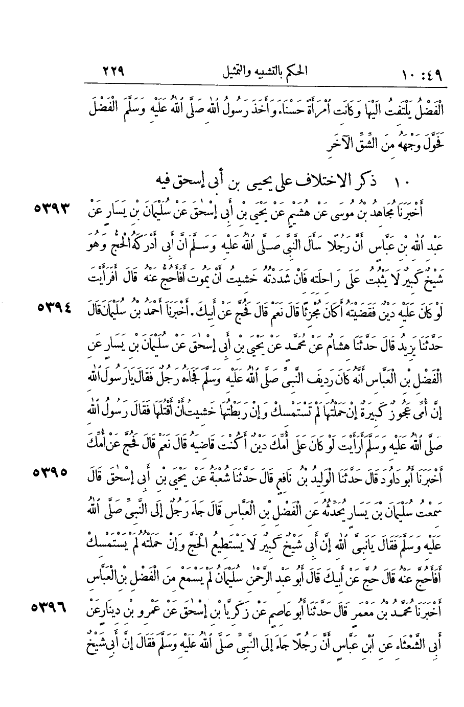 5394 - أَخْبَرَنَا أَحْمَدُ بْنُ سُلَيْمَانَ، قَالَ: حَدَّثَنَا يَزِيدُ، قَالَ: حَدَّثَنَا هِشَامٌ، عَنْ مُحَمَّدٍ، عَنْ يَحْيَى بْنِ أَبِي إِسْحَقَ، عَنْ سُلَيْمَانَ بْنِ يَسَارٍ، عَنْ الْفَضْلِ بْنِ الْعَبَّاسِ، أَنَّهُ كَانَ رَدِيفَ النَّبِيِّ صَلَّى اللهُ عَلَيْهِ وَسَلَّمَ، فَجَاءَهُ رَجُلٌ فَقَالَ: يَا رَسُولَ اللَّهِ، إِنَّ أُمِّي عَجُوزٌ كَبِيرَةٌ، إِنْ حَمَلْتُهَا لَمْ تَسْتَمْسِكْ، وَإِنْ رَبَطْتُهَا خَشِيتُ أَنْ أَقْتُلَهَا، فَقَالَ رَسُولُ اللَّهِ صَلَّى اللهُ عَلَيْهِ وَسَلَّمَ: «§أَرَأَيْتَ لَوْ كَانَ عَلَى أُمِّكَ دَيْنٌ أَكُنْتَ قَاضِيَهُ؟» قَالَ: نَعَمْ، قَالَ: «فَحُجَّ عَنْ أُمِّكَ»