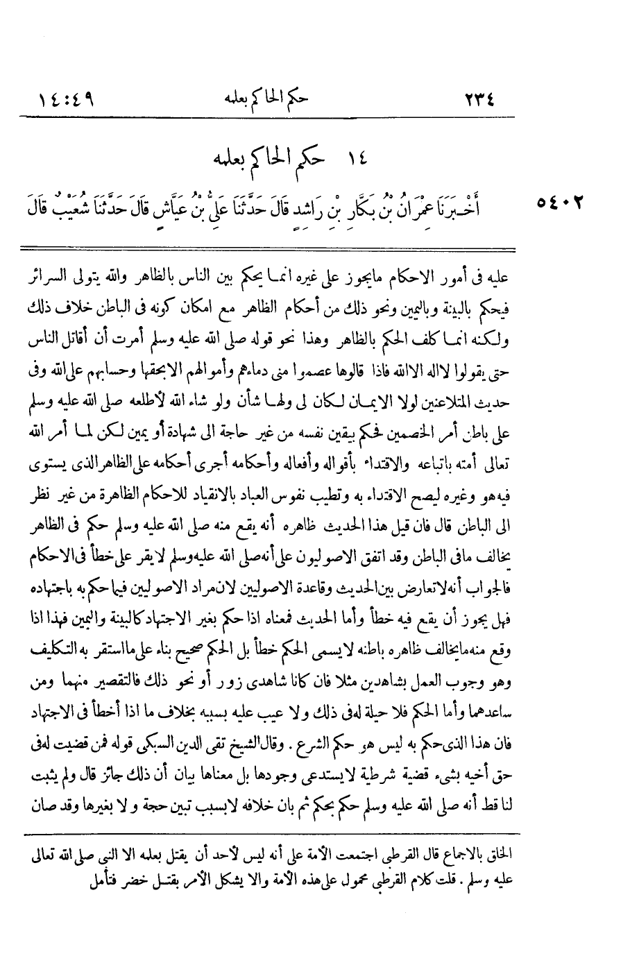 عَلَيْهِ فِي أُمُورِ الْأَحْكَامِ مَا يَجُوزُ عَلَى غَيْرِهِ إِنَّمَا يَحْكُمُ بَيْنَ النَّاسِ بِالظَّاهِرِ وَاَللَّهُ يَتَوَلَّى السَّرَائِرَ فَيَحْكُمُ بِالْبَيِّنَةِ وَبِالْيَمِينِ وَنَحْوِ ذَلِكَ مِنْ أَحْكَامِ الظَّاهِرِ مَعَ إِمْكَانِ كَوْنِهِ فِي الْبَاطِنِ خِلَافَ ذَلِكَ وَلَكِنَّهُ إِنَّمَا كُلِّفَ الْحُكْمَ بِالظَّاهِرِ وَهَذَا نَحْوُ قَوْلِهِ صَلَّى اللَّهُ عَلَيْهِ وَسَلَّمَ أُمِرْتُ أَنْ أُقَاتِلَ النَّاسَ حَتَّى يَقُولُوا لَا إِلَهَ إِلَّا اللَّهُ فَإِذَا قَالُوهَا عَصَمُوا مِنِّي دِمَاءَهُمْ وَأَمْوَالَهُمْ إِلَّا بِحَقِّهَا وَحِسَابُهُمْ عَلَى اللَّهِ وَفِي حَدِيثِ الْمُتَلَاعِنَيْنِ لَوْلَا الْأَيمَانُ لَكَانَ لِي وَلَهَا شَأْنٌ وَلَوْ شَاءَ اللَّهُ لَأَطْلَعَهُ صَلَّى اللَّهُ عَلَيْهِ وَسَلَّمَ عَلَى بَاطِنِ أَمْرِ الْخَصْمَيْنِ فَحَكَمَ بِيَقِينِ نَفْسِهِ مِنْ غَيْرِ حَاجَةٍ إِلَى شَهَادَةٍ أَوْ يَمِينٍ لَكِنْ لَمَّا أَمَرَ اللَّهُ تَعَالَى أُمَّتَهُ بِاتِّبَاعِهِ وَالِاقْتِدَاءِ بِأَقْوَالِهِ وَأَفْعَالِهِ وَأَحْكَامِهِ أَجْرَى أَحْكَامَهُ عَلَى الظَّاهِرِ الَّذِي يَسْتَوِي فِيهِ هُوَ وَغَيْرُهُ لِيَصِحَّ الِاقْتِدَاءُ بِهِ وَتَطِيبَ نُفُوسُ الْعِبَادِ بِالِانْقِيَادِ لِلْأَحْكَامِ الظَّاهِرَةِ مِنْ غَيْرِ نَظَرٍ إِلَى الْبَاطِنِ قَالَ فَإِنْ قِيلَ هَذَا الْحَدِيثُ ظَاهِرُهُ أَنَّهُ يَقَعُ مِنْهُ صَلَّى اللَّهُ عَلَيْهِ وَسَلَّمَ حُكْمٌ فِي الظَّاهِرِ يُخَالِفُ مَا فِي الْبَاطِنِ وَقَدِ اتَّفَقَ الْأُصُولِيُّونَ عَلَى أَنَّهُ صَلَّى اللَّهُ عَلَيْهِ وَسَلَّمَ لَا يُقَرُّ عَلَى خَطَأٍ فِي الْأَحْكَامِ فَالْجَوَابُ أَنَّهُ لَا تَعَارُضَ بَيْنَ الْحَدِيثِ وَقَاعِدَةِ الْأُصُولِيِّينَ لِأَنَّ مُرَادَ الْأُصُولِيِّينَ فِيمَا حَكَمَ بِهِ بِاجْتِهَادِهِ فَهَلْ يَجُوزُ أَنْ يَقَعَ فِيهِ خَطَأٌ وَأَمَّا الْحَدِيثُ فَمَعْنَاهُ إِذَا حَكَمَ بِغَيْرِ الِاجْتِهَادِ كَالْبَيِّنَةِ وَالْيَمِينِ فَهَذَا إِذَا وَقَعَ مِنْهُ مَا يُخَالِفُ ظَاهِرُهُ بَاطِنَهُ لَا يُسَمَّى الْحُكْمُ خَطَأً بَلِ الْحُكْمُ صَحِيحٌ بِنَاءً عَلَى مَا اسْتَقَرَّ بِهِ التَّكْلِيفُ وَهُوَ وُجُوبُ الْعَمَلِ بِشَاهِدَيْنِ مَثَلًا فَإِنْ كَانَا شَاهِدَيْ زُورٍ أَوْ نَحْوَ ذَلِكَ فَالتَّقْصِيرُ مِنْهُمَا وَمَنْ سَاعَدَهُمَا وَأَمَّا الْحُكْمُ فَلَا حِيلَةَ لَهُ فِي ذَلِكَ وَلَا عَيْبَ عَلَيْهِ بِسَبَبِهِ بِخِلَافِ مَا إِذَا أَخْطَأَ فِي الِاجْتِهَادِ فَإِنَّ هَذَا الَّذِي حَكَمَ بِهِ لَيْسَ هُوَ حُكْمَ الشَّرْعِ وَقَالَ الشَّيْخُ تَقِيُّ الدِّينِ السُّبْكِيُّ قَوْلُهُ فَمَنْ قَضَيْتُ لَهُ فِي حَقِّ أَخِيهِ بِشَيْءٍ قَضِيَّةً شَرْطِيَّةً لَا يُسْتَدْعَى وُجُودُهَا بَلْ مَعْنَاهَا بَيَانُ أَنَّ ذَلِكَ جَائِزٌ قَالَ وَلَمْ يَثْبُتْ لَنَا قَطُّ أَنَّهُ صَلَّى اللَّهُ عَلَيْهِ وَسَلَّمَ حَكَمَ بِحُكْمٍ ثُمَّ بَانَ خِلَافُهُ لَا بِسَبَبِ تَبَيُّنِ حُجَّةٍ وَلَا بِغَيْرِهَا وَقَدْ صَانَ