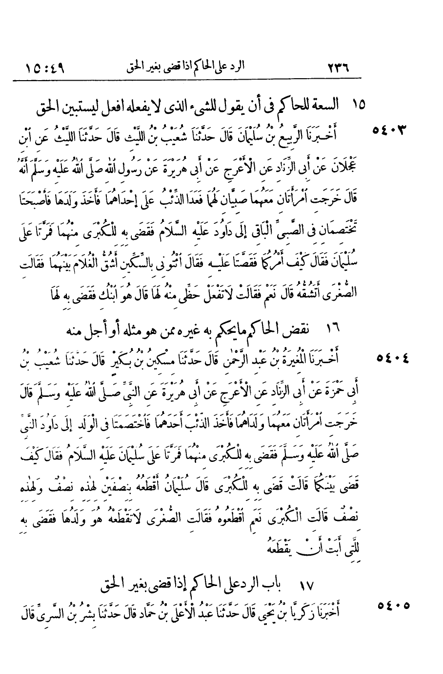 5404 - أَخْبَرَنَا الْمُغِيرَةُ بْنُ عَبْدِ الرَّحْمَنِ، قَالَ: حَدَّثَنَا مِسْكِينُ بْنُ بُكَيْرٍ، قَالَ: حَدَّثَنَا شُعَيْبُ بْنُ أَبِي حَمْزَةَ، عَنْ أَبِي الزِّنَادِ، عَنْ الْأَعْرَجِ، عَنْ أَبِي هُرَيْرَةَ، عَنِ النَّبِيِّ صَلَّى اللهُ عَلَيْهِ وَسَلَّمَ قَالَ: " §خَرَجَتِ امْرَأَتَانِ مَعَهُمَا وَلَدَاهُمَا، فَأَخَذَ الذِّئْبُ أَحَدَهُمَا، فَاخْتَصَمَتَا فِي الْوَلَدِ إِلَى دَاوُدَ النَّبِيِّ صَلَّى اللهُ عَلَيْهِ وَسَلَّمَ، فَقَضَى بِهِ لِلْكُبْرَى مِنْهُمَا، فَمَرَّتَا عَلَى سُلَيْمَانَ عَلَيْهِ السَّلَامُ، فَقَالَ: كَيْفَ قَضَى بَيْنَكُمَا؟ قَالَتْ: قَضَى بِهِ لِلْكُبْرَى، قَالَ سُلَيْمَانُ: أَقْطَعُهُ بِنِصْفَيْنِ لِهَذِهِ نِصْفٌ، وَلِهَذِهِ نِصْفٌ، قَالَتِ الْكُبْرَى: نَعَمْ، اقْطَعُوهُ، فَقَالَتِ الصُّغْرَى: لَا تَقْطَعْهُ، هُوَ وَلَدُهَا، فَقَضَى بِهِ لِلَّتِي أَبَتْ أَنْ يَقْطَعَهُ "