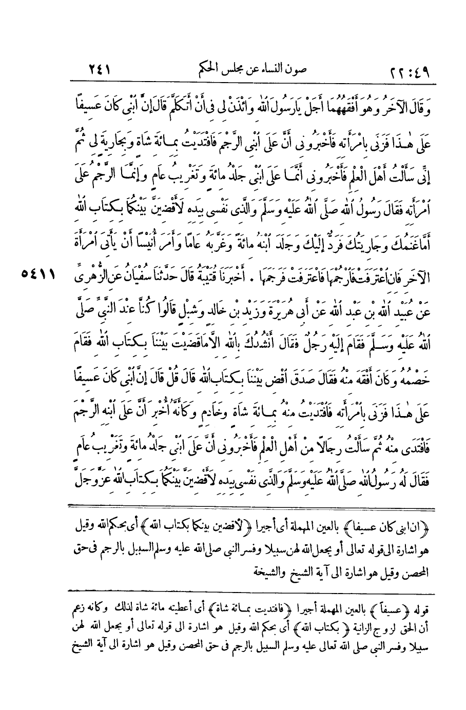 [5410] إِنَّ ابْنِي كَانَ عَسِيفًا بِالْعَيْنِ الْمُهْمَلَةِ أَيْ أَجِيرًا لَأَقْضِيَنَّ بَيْنَكُمَا بِكِتَابِ اللَّهِ أَيْ بِحُكْمِ اللَّهِ وَقِيلَ هُوَ إِشَارَةٌ إِلَى قَوْلِهِ تَعَالَى أَو يَجْعَل الله لَهُنَّ سَبِيلا وَفَسَّرَ النَّبِيُّ صَلَّى اللَّهُ عَلَيْهِ وَسَلَّمَ السَّبِيلَ بِالرَّجْمِ فِي حَقِّ الْمُحْصَنِ وَقِيلَ هُوَ إِشَارَةٌ إِلَى آيَةِ الشَّيْخِ وَالشَّيْخَةِ