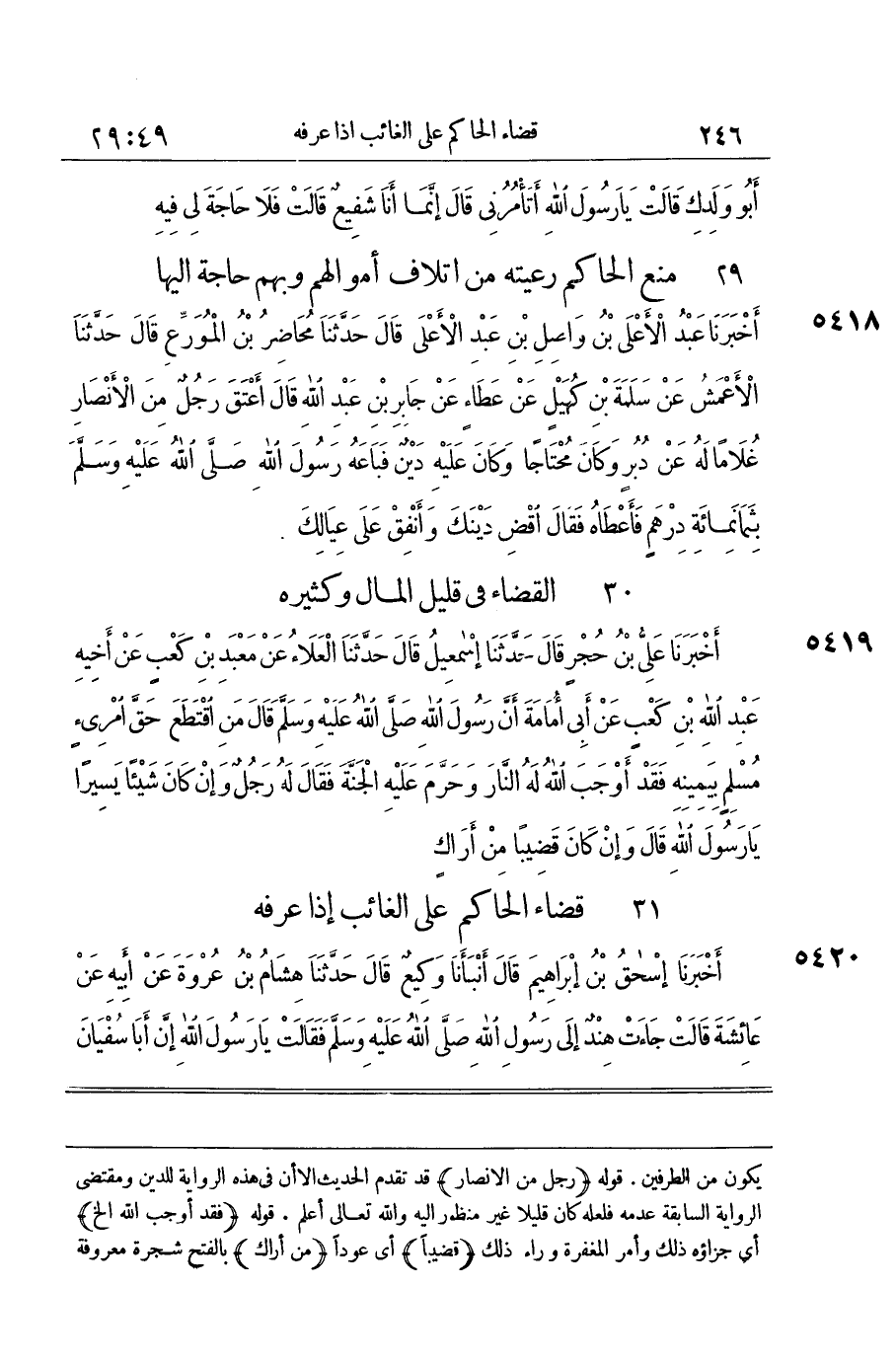 [5419] فقد أوجب الله الخ أَي جَزَاؤُهُ ذَلِك وَأمر الْمَغْفِرَة وَرَاء ذَلِك قَضِيبًا أَي عودا من أَرَاك بِالْفَتْح شَجَرَة مَعْرُوفَة قَوْله بِالْمَعْرُوفِ أَي بِالْقدرِ الْمُعْتَاد بَين أهل الْعرف لَا الزَّائِد على قدر الْحَاجة وَمن لم ير الْقَضَاء على الْغَائِب يحمل الحَدِيث على أَنه أفتاها بِهِ وَبَين لَهَا أَنه حَلَال وَالْفَتْوَى غير الْقَضَاء وَالله تَعَالَى أعلم قَوْله
