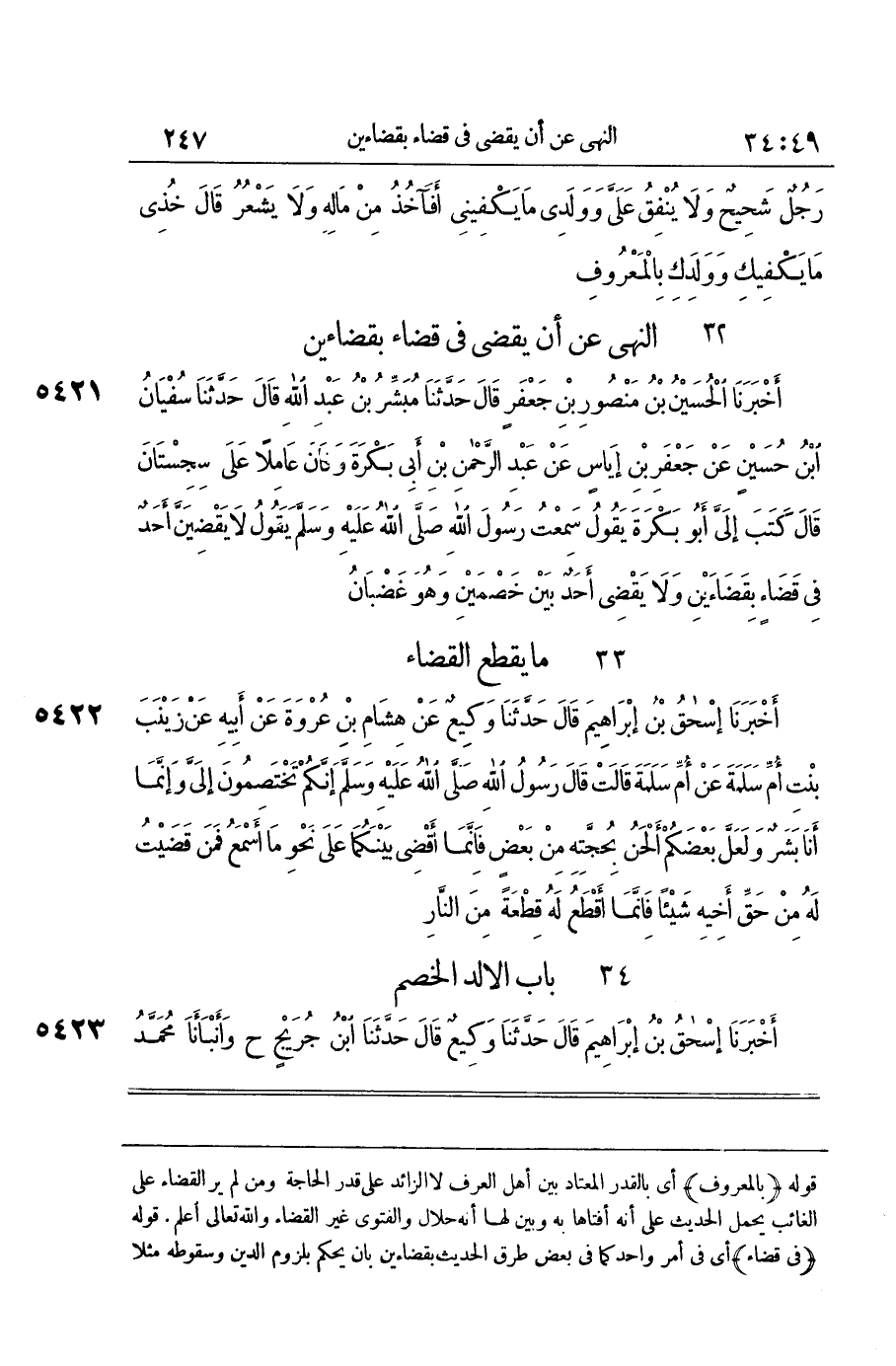 [5421] فِي قَضَاء أَي فِي أَمر وَاحِد كَمَا فِي بعض طرق الحَدِيث بقضاءين بِأَن يحكم بِلُزُوم الدّين وسقوطه مثلا إِذْ الْمَقْصُود من نصب الْقُضَاة قطع النزاع وَلَا يَنْقَطِع بِمثل هَذَا الْقَضَاء قَوْله
