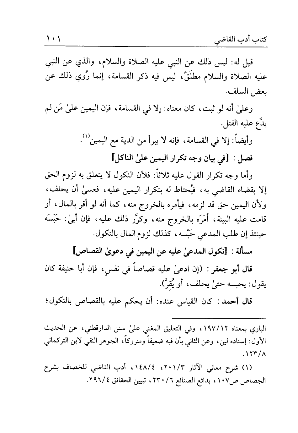 قال أبو جعفر: (إن ادعى عليه قصاصًا في نفس، فإن أبا حنيفة كان يقول: يحبسه حتى يحلف، أو يقر).