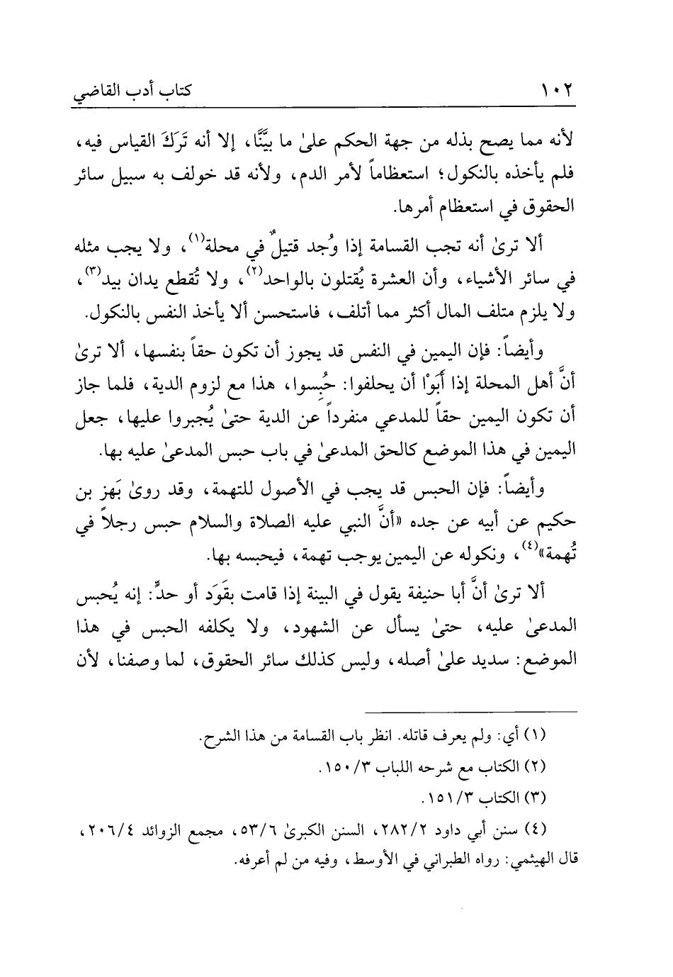 ألا ترى أن أبا حنيفة يقول في البينة إذا قامت بقود أو حد: إنه يحبس المدعى عليه، حتى يسأل عن الشهود، ولا يكلفه الحبس في هذا الموضع: سديد على أصله، وليس كذلك سائر الحقوق، لما وصفنا، لأن