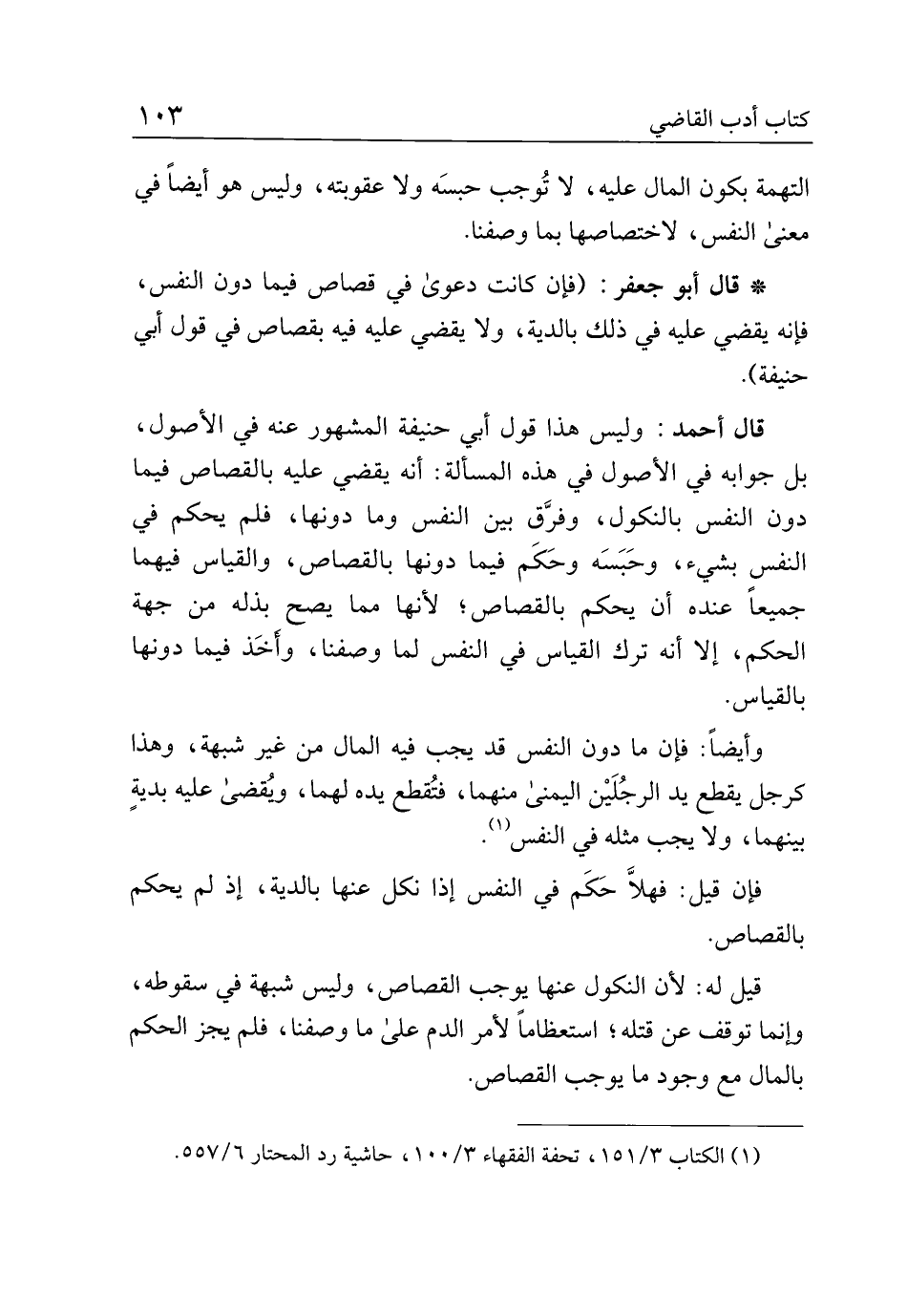 قال أحمد: وليس هذا قول أبي حنيفة المشهور عنه في الأصول، بل جوابه في الأصول في هذه المسألة: أنه يقضي عليه بالقصاص فيما دون النفس بالنكول، وفرق بين النفس وما دونها، فلم يحكم في النفس بشيء، وحبسه وحكم فيما دونها بالقصاص، والقياس فيهما جميعًا عنده أن يحكم بالقصاص؛ لأنها مما يصح بذله من جهة الحكم، إلا أنه ترك القياس في النفس لما وصفنا، وأخذ فيما دونها بالقياس.