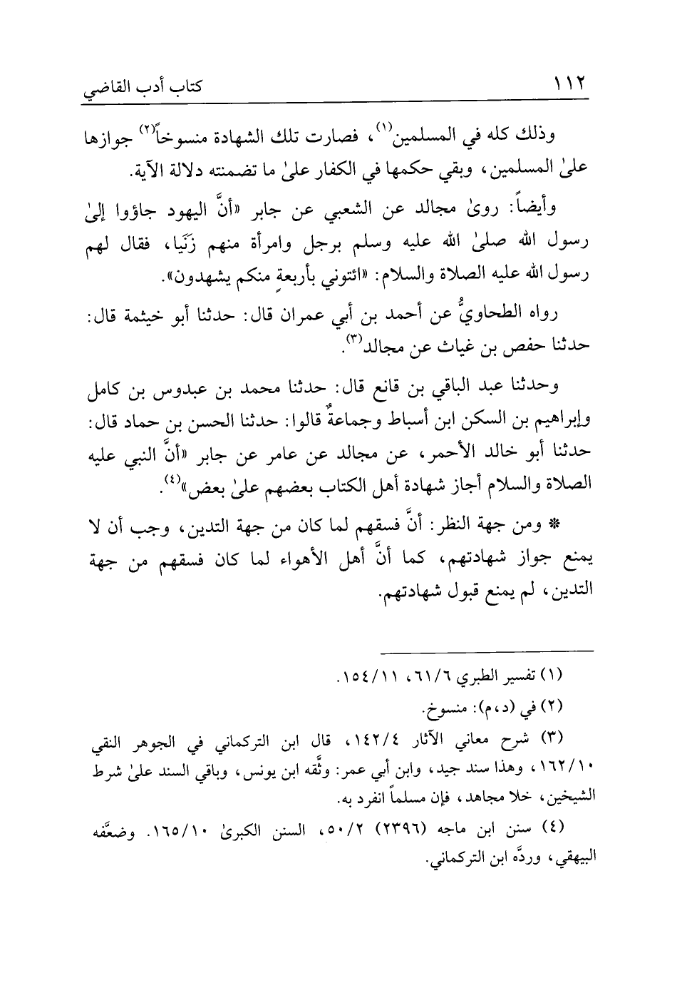 وحدثنا عبد الباقي عن قانع قال: حدثنا محمد بن عبدوس بن كامل وإبراهيم بن السكن ابن أسباط وجماعة قالوا: حدثنا الحسن بن حماد قال: حدثنا أبو خالد الأحمر، عن مجالد عن عامر عن جابر "أن النبي عليه الصلاة والسلام أجاز شهادة أهل الكتاب بعضهم على بعض".