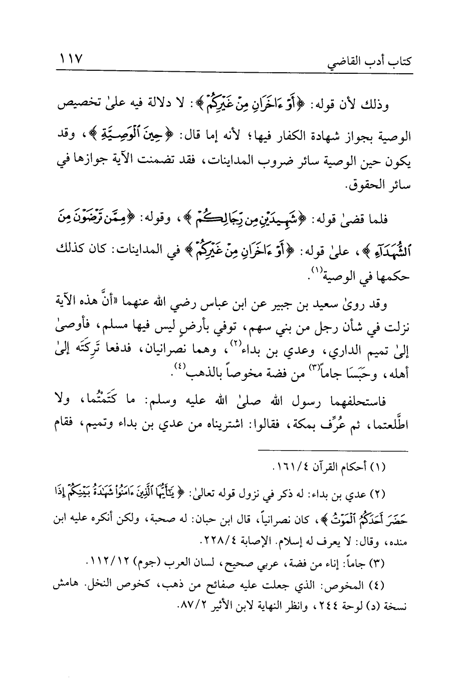 وقد روى سعيد بن جبير عن ابن عباس رضي الله عنهما "أن هذه الآية نزلت في شأن رجل من بني سهم، توفي بأرض ليس فيها مسلم، فأوصى إلى تميم الداري، وعدي بن بداء، وهما نصرانيان، فدفعا تركته إلى أهله، وحبسا جاما من فضة مخوصًا بالذهب.
