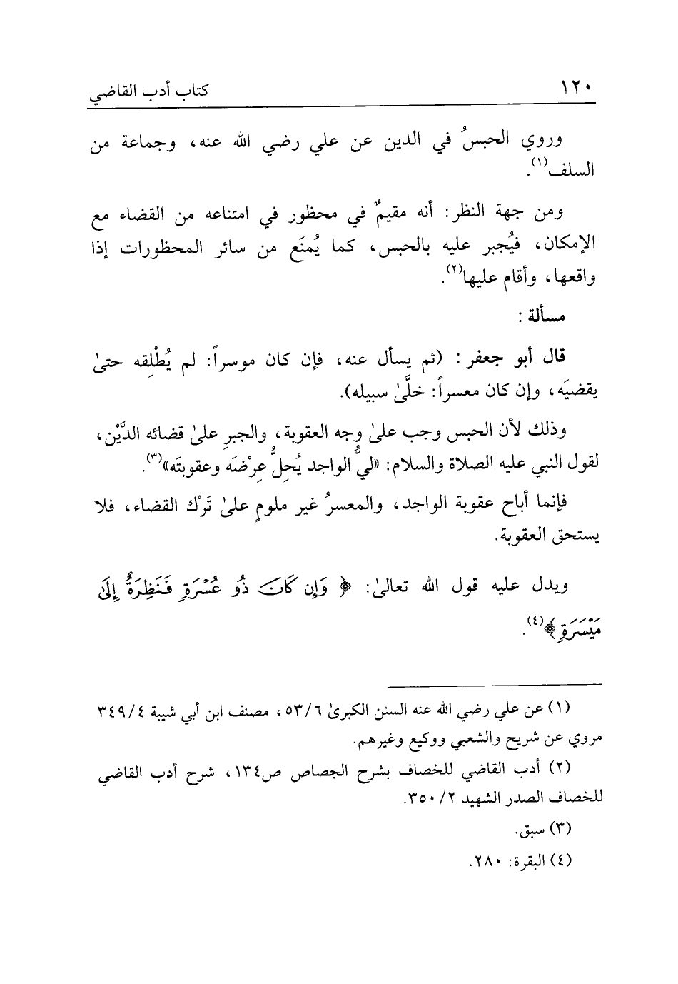 قال أبو جعفر: (ثم يسأل عنه، فإن كان موسرًا: لم يطلقه حتى يقضيه، وإن كان معسرًا: خلى سبيله).