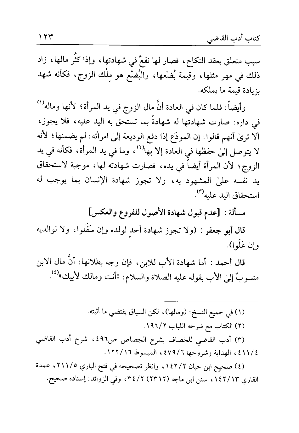 قال أحمد: أما شهادة الأب للابن، فإن وجه بطلانها: أن مال الابن منسوب إلى الأب بقوله عليه الصلاة والسلام: "أنت ومالك لأبيك".