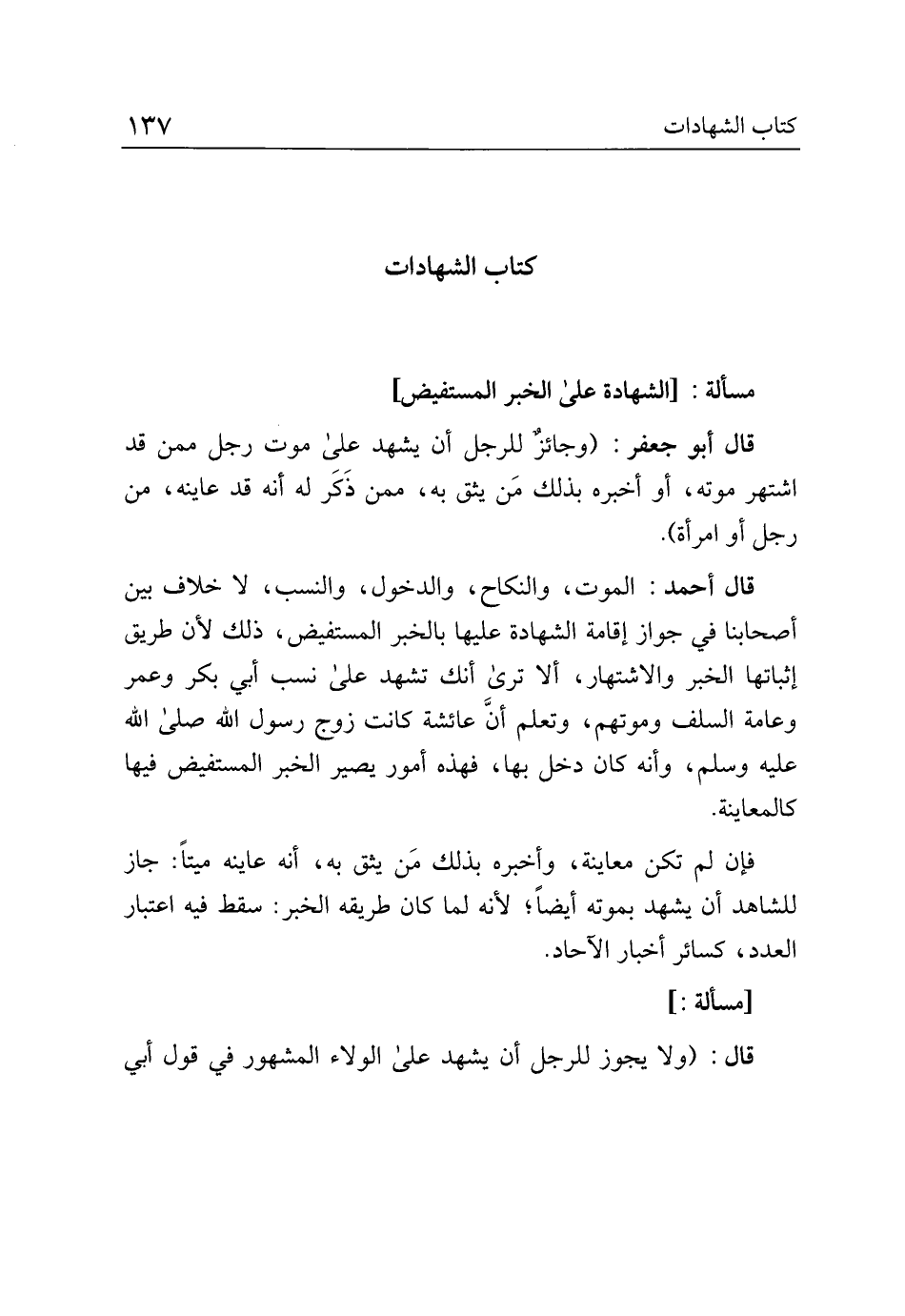 قال أبو جعفر: (وجائز للرجل أن يشهد على موت رجل ممن قد اشتهر موته، أو أخبره بذلك من يثق به، ممن ذكر له أنه قد عاينه، من رجل أو امرأة).
