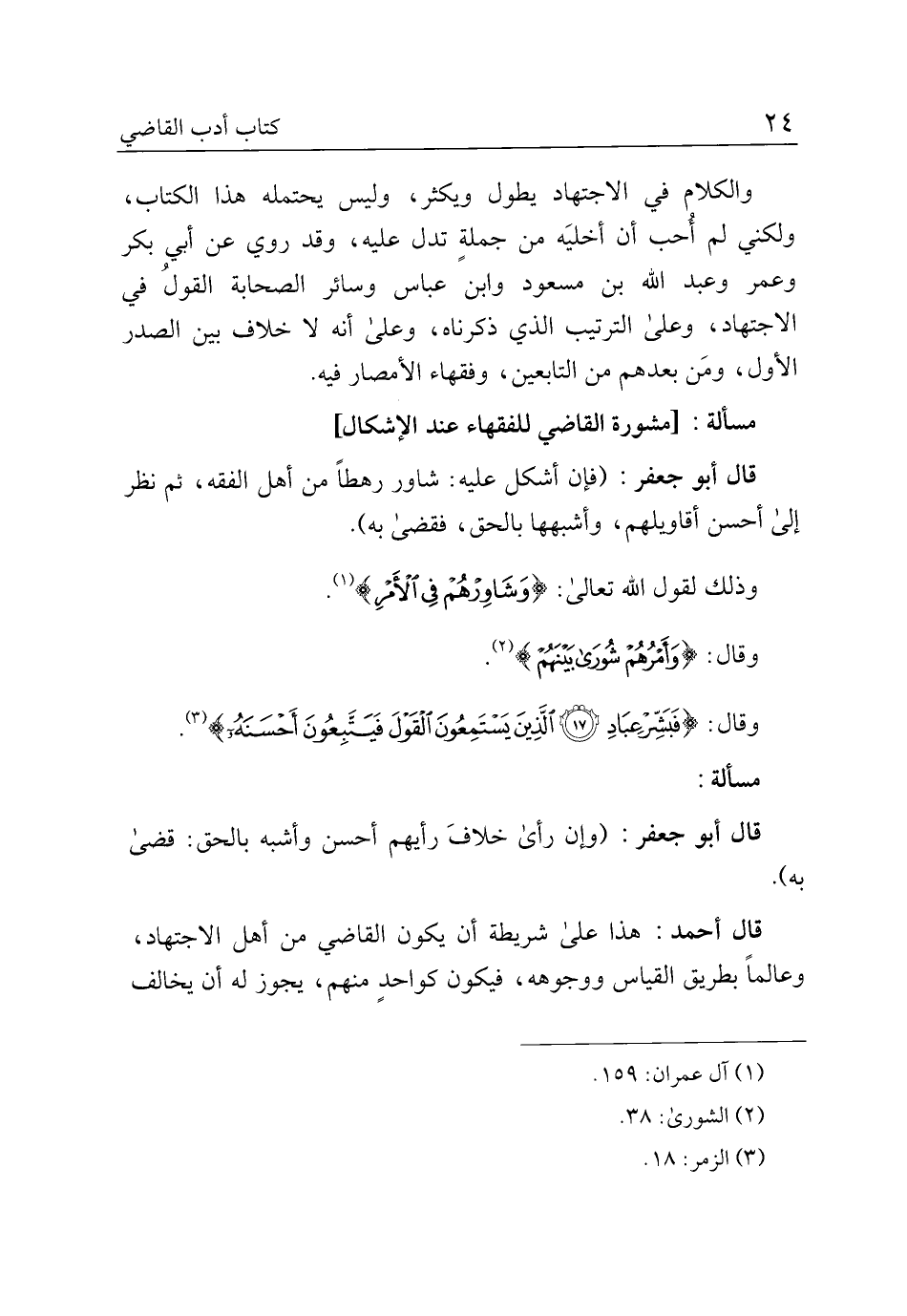 قال أبو جعفر: (فإن أشكل عليه: شاور رهطًا من أهل الفقه، ثم نظر إلى أحسن أقاويلهم، وأشبهها بالحق، فقضى به).