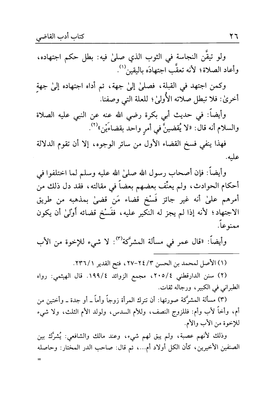وأيضًا: فإن أصحاب رسول الله صلى الله عليه وسلم لما اختلفوا في أحكام الحوادث، ولم يعنف بعضهم بعضًا في مقالته، فقد دل ذلك من أمرهم على أنه غير جائز فسخ قضاء من قضى بمذهبه من طريق الاجتهاد؛ لأنه إذا لم يجز له النكير عليه، ففسخ قضائه أولى أن يكون ممنوعًا.