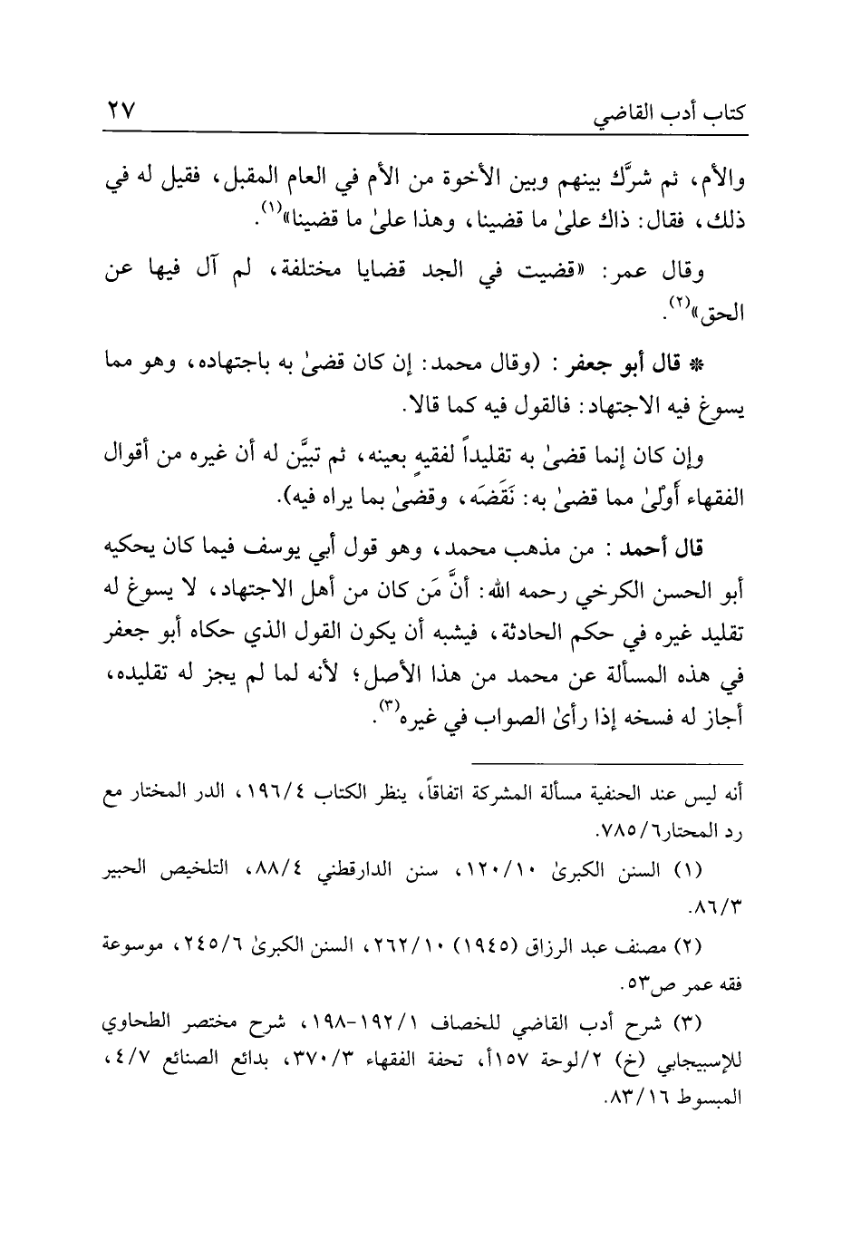 والأم، ثم شرك بينهم وبين الأخوة من الأم في العام المقبل، فقيل له في ذلك، فقال: ذاك على ما قضينا، وهذا على ما قضينا".
