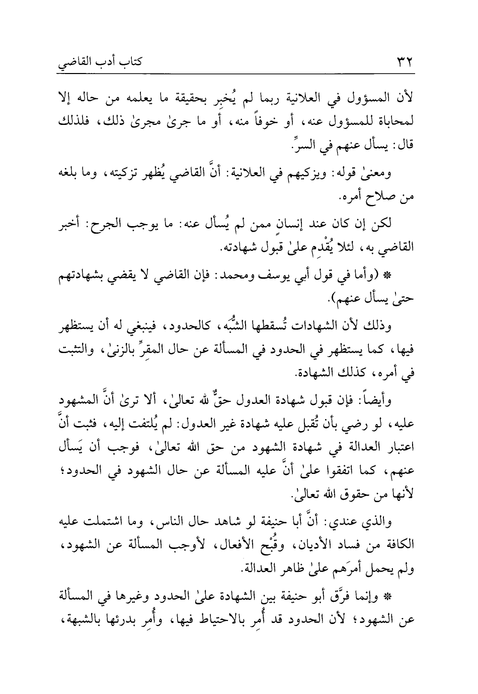والذي عندي: أن أبا حنيفة لو شاهد حال الناس، وما اشتملت عليه الكافة من فساد الأديان، وقبح الأفعال، لأوجب المسألة عن الشهود، ولم يحمل أمرهم على ظاهر العدالة.
