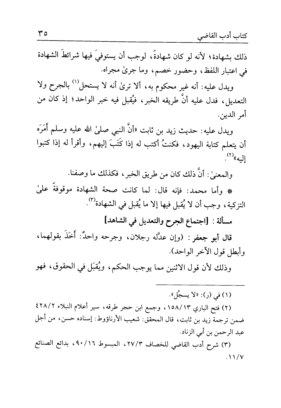 قال أبو جعفر: (وإن عدله رجلان، وجرحه واحد: أخذ بقولهما، وأبطل قوله الآخر الواحد).
